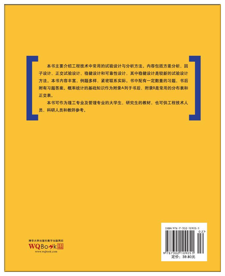 本书主要介绍工程技术中常用的试验设计与分析方法.内容包括方差分析、因子设计、正交试验设计、稳健设计和可靠性设计,其中稳健设计是较新的试验设计方法.本书内容丰富,例题多样,紧密联系实际.书中配有一定数量的习题,书后附有习题答案.概率统计的基础知识作为附录A列于书后,附录B是常用的分布表和正交表. 本书可作为理工科各专业及管理专业的大学生、研究生的教材,也可供工程技术人员、科研人员和教师参考.
