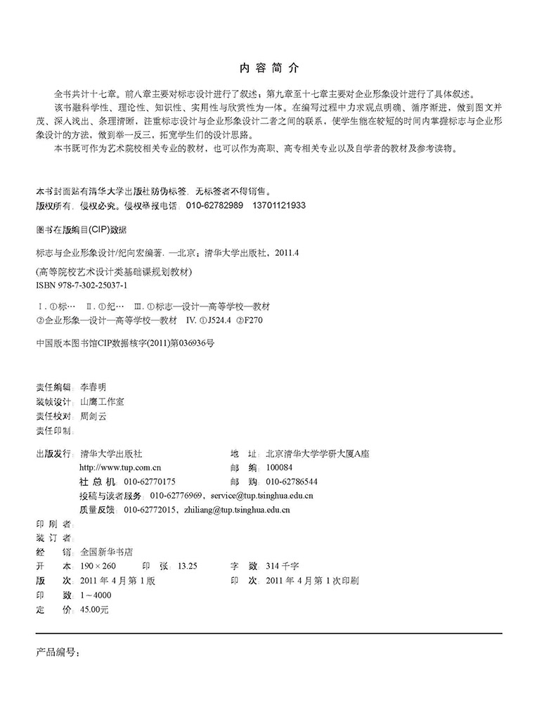 全书共计十七章。前八章主要对标志设计进行了叙述;第九章至十七章主要对企业形象设计进行了具体叙述。 该书融科学性、理论性、知识性、实用性与欣赏性为一体。在编写过程中力求观点明确、循序渐进,做到图文并茂、深入浅出、条理清晰,注重标志设计与企业形象设计二者之间的联系,使学生能在较短的时间内掌握标志与企业形象设计的方法,做到举一反三,拓宽学生们的设计思路。 本书既可作为艺术院校相关专业的教材,也可以作为高职、高专相关专业以及自学者的教材及参考读物。