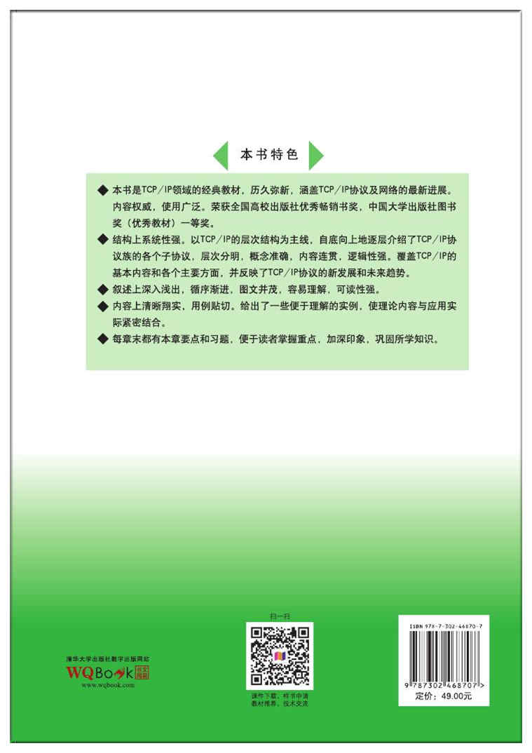 2. 结构上系统性强。以TCP/IP的层次结构为主线,自底向上地逐层介绍了TCP/IP协议族的各个子协议,层次分明,概念准确,内容连贯,逻辑性强。覆盖TCP/IP的基本内容和各个主要方面,并反映了TCP/IP协议的新发展和未来趋势。