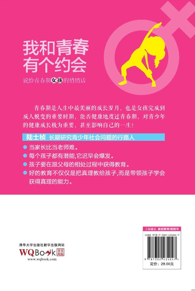 青春期是女孩完成到女人的蜕变的重要时期,身心的快速变化往往会造成各种各样的困扰和疑虑。能否健康地度过青春期,对青少年的健康成长极为重要。 本书以一种坦率、真实的态度讲述了青春期的生理发展、心理变化、社会性发展等现象,并试图通过回答是什么、为什么、怎么办等一系列问题,努力为广大青少年答疑解惑,帮助少女健康快乐成长。