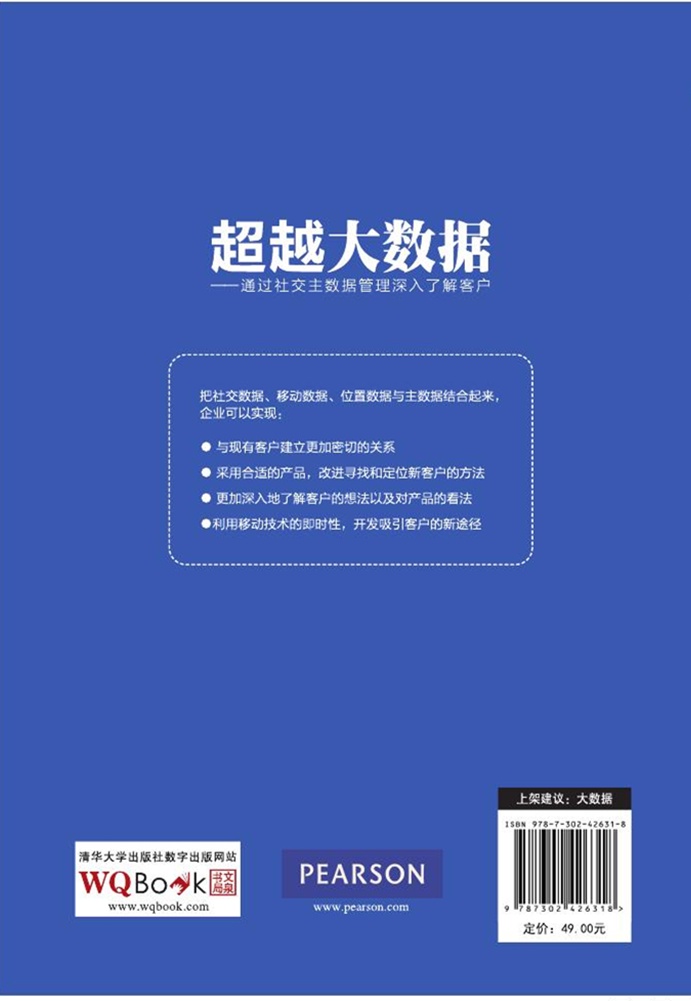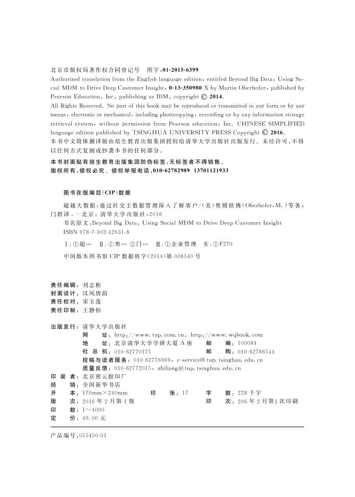 Authorized translation from the English language edition, entitled Beyond Big Data: Using Social MDM to Drive Deep Customer Insight, 013350980X by Martin Oberhofer, published by Pearson Education, Inc, publishing as IBM, copyright 2014. All Rights Reserved. No part of this book may be reproduced or transmitted in any form or by any means, electronic or mechanical, including photocopying, recording or by any information storage retrieval system, without permission from Pearson education, Inc. CHINESE SIMPLIFIED language edition published by TSINGHUA UNIVERSITY PRESS Copyright 2016.
