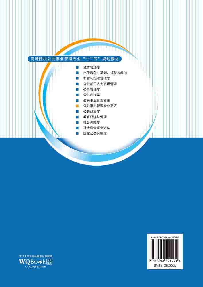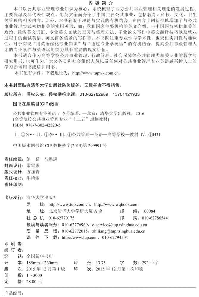 本书以公共事业管理专业知识为核心,系统梳理了西方公共事业管理相关理论的发展过程、主要流派及其代表性观点。用英文全面介绍了中国主要公共事业,包括教育、科技、文化、卫生等管理的相关内容。此外,本书着眼于理论与实践的有机结合,在内容上创新性地增加了与公共事业管理实践密切相关的实用英语,如:党和国家主要机构的英文介绍、与中国国情密切相关的政治、经济英文词汇、专业英文文献的查阅与整理方法、毕业论文写作中英文翻译技巧以及就业过程中的面试英语、英文商务信函的写作等。本书既注重专业性与学术性,也突出实用性与趣味 性,对于实现“用英语深化专业知识”与“通过专业学英语”的有机结合,提高公共事业管理人才的专业素养与英语运用能力具有重要的现实价值。 本书适合作为高等学校公共事业管理、行政管理、社会保障等公共管理类相关专业的教学与研究用书,也可作为广大公务员和社会组织人员以及任何对公共事业管理专业英语感兴趣人士的学习参考用书或培训用书。 本书配有课件,下载地址为:http://www.tupwk.com.cn。
