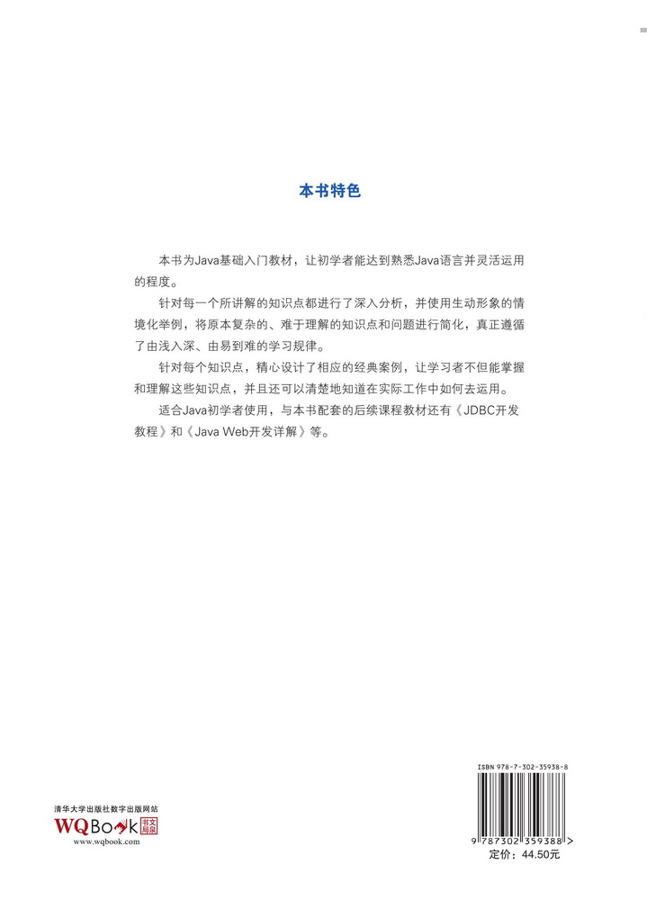 本书从初学者的角度详细讲解了Java开发中重点用到的多种技术。全书共11章,包括Java开发环境的搭建及其运行机制、基本语法、面向对象的思想,采用典型翔实的例子、通俗易懂的语言阐述面向对象中的抽象概念。在多线程、常用API、集合、IO、GUI、网络编程章节中,通过剖析案例、分析代码结构含义、解决常见问题等方式,帮助初学者培养良好的编程习惯。最后,讲解了Eclipse开发工具,帮助初学者熟悉开发工具的使用。 本书附有配套视频、源代码、测试题、教学PPT、教学实施案例、教学设计大纲等资源,并提供在线答疑平台。 本书既可作为高等院校本、专科计算机相关专业的程序设计课程教材,也可作为Java技术基础的培训教材,是一本适合广大计算机编程初学者的入门级教材。