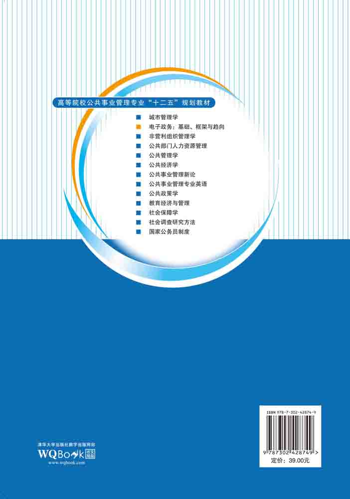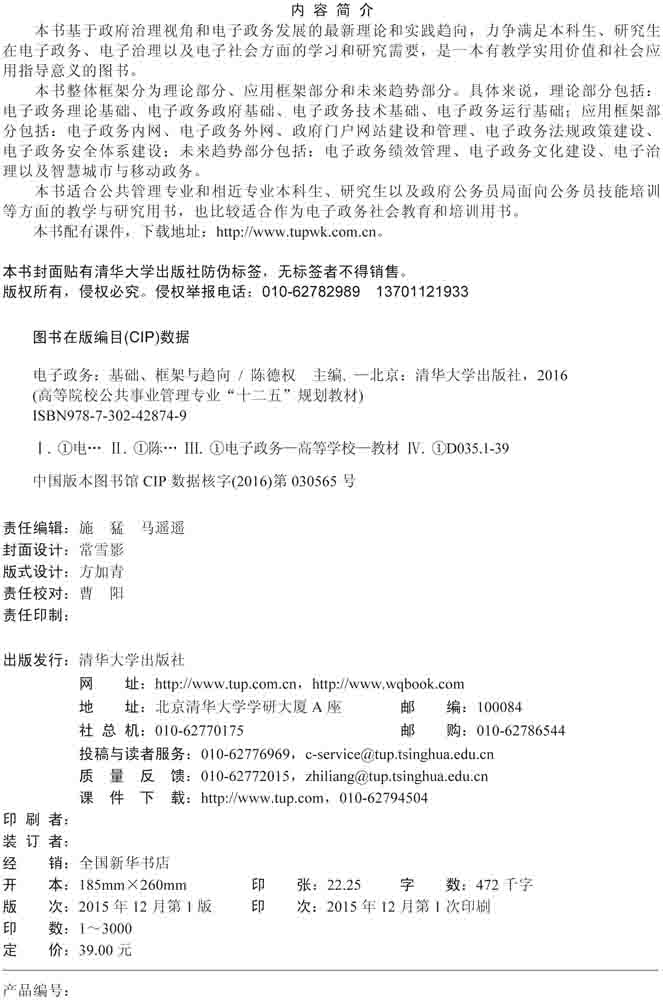 本书基于政府治理视角和电子政务发展的最新理论和实践趋向,力争满足本科生、研究生在电子政务、电子治理以及电子社会方面的学习和研究需要,是一本有教学实用价值和社会应用指导意义的图书。 本书整体框架分为理论部分、应用框架部分和未来趋势部分。具体来说,理论部分包括:电子政务理论基础、电子政务政府基础、电子政务技术基础、电子政务运行基础;应用框架部分包括:电子政务内网、电子政务外网、政府门户网站建设和管理、电子政务法规政策建设、电子政务安全体系建设;未来趋势部分包括:电子政务绩效管理、电子政务文化建设、电子治理以及智慧城市与移动政务。 本书适合公共管理专业和相近专业本科生、研究生以及政府公务员局面向公务员技能培训等方面的教学与研究用书,也比较适合作为电子政务社会教育和培训用书。 本书配有课件,下载地址:http://www.tupwk.com.cn。