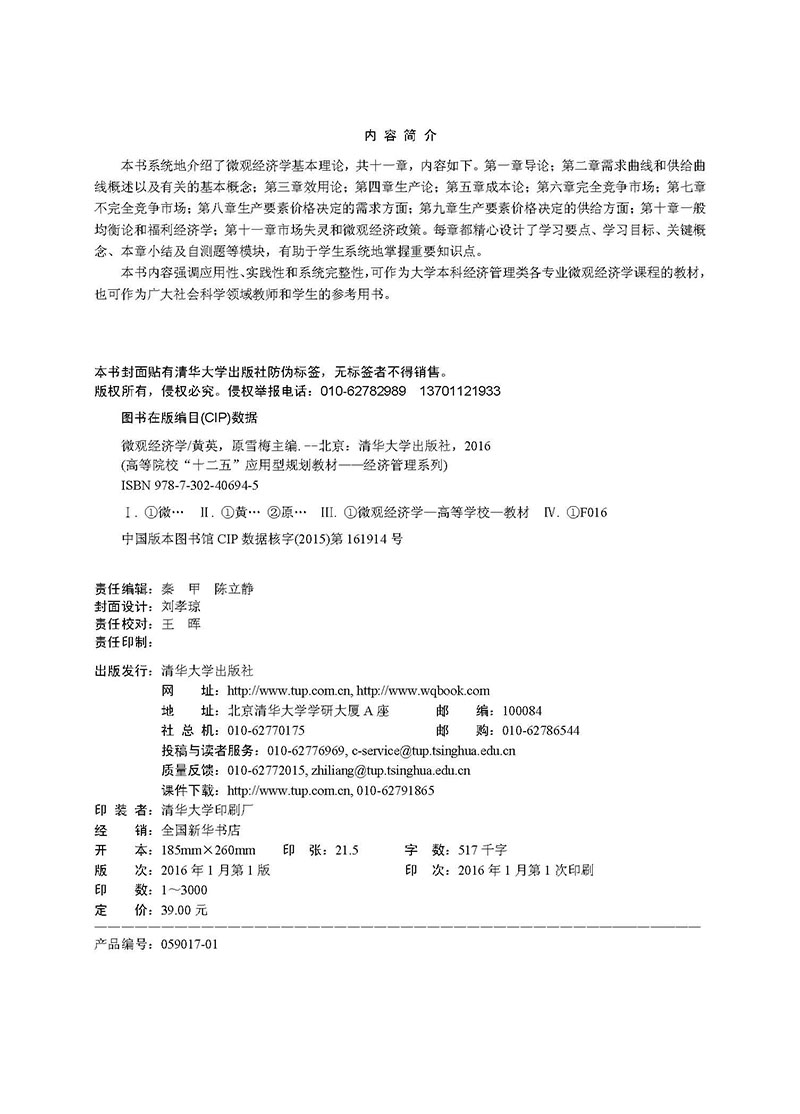 本书系统地介绍了微观经济学基本理论,共十一章,内容如下。第一章导论;第二章需求曲线和供给曲线概述以及有关的基本概念;第三章效用论;第四章生产论;第五章成本论;第六章完全竞争市场;第七章不完全竞争市场;第八章生产要素价格决定的需求方面;第九章生产要素价格决定的供给方面;第十章一般均衡论和福利经济学;第十一章市场失灵和微观经济政策。每章都精心设计了学习要点、学习目标、关键概念、本章小结及自测题等模块,有助于学生系统地掌握重要知识点。 本书内容强调应用性、实践性和系统完整性,可作为大学本科经济管理类各专业微观经济学课程的教材,也可作为广大社会科学领域教师和学生的参考用书。