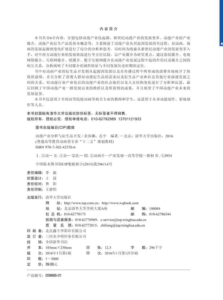 本书共分6章内容,分别包括动漫产业化起源、新世纪动漫产业的发展变革、动漫产业的产业媒介、动漫产业衍生产品的基本概念等,主要阐述了动漫产业从兴起到发展的全过程,对动画、漫画的发展起源到变化扩展进行了综合的分析和思考。以时间为线索从新世纪动漫产业的发展变革入手,对中西方动漫行业的发展状况进行全方位比较。以产业媒介为研究重点,通过影院媒介、电视网络媒介、互联网媒介、纸媒介、数字互联网媒介在动漫产业发展过程中起的作用以及媒介之间的相互关系,分析阐明了不同媒介的属性特征与不同发展历史时期的定位。 书中对动画产业的衍生品开发则从起源到发展以及在传播过程中所形成的消费市场展开了细致的说明,并且分析了消费人群对动漫衍生品的需求以及衍生品产业和社会其他行业渗透发展之间的关系,对动漫行业产业化后的动漫产业的社会地位以及人员结构变化进行了分析和反思。最后回顾了中国动漫产业一路发展以来的挫折以及所获得的成果,并且展望了中国动漫产业未来的发展前景。 本书不仅适用于全国高等院校动画等相关专业的教师和学生,还适用于从事动漫制作、影视制作等人员。