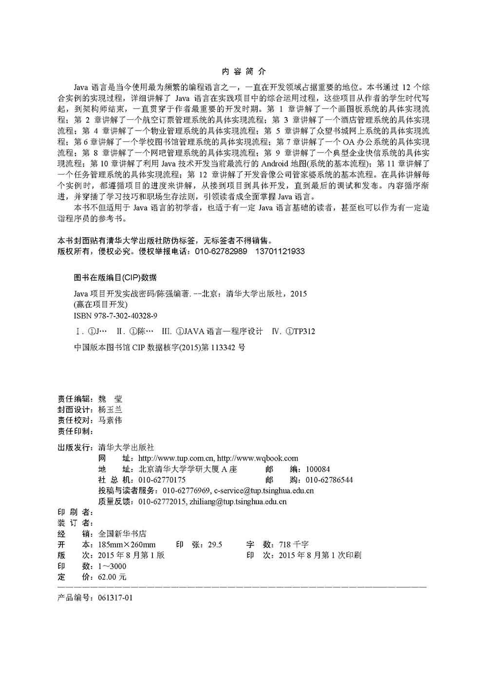 Java语言是当今使用最为频繁的编程语言之一,一直在开发领域占据重要的地位。本书通过12个综合实例的实现过程,详细讲解了Java语言在实践项目中的综合运用过程,这些项目从作者的学生时代写起,到架构师结束,一直贯穿于作者最重要的开发时期。第1章讲解了一个画图板系统的具体实现流程;第2章讲解了一个航空订票管理系统的具体实现流程;第3章讲解了一个酒店管理系统的具体实现流程;第4章讲解了一个物业管理系统的具体实现流程;第5章讲解了众望书城网上系统的具体实现流程;第6章讲解了一个学校图书馆管理系统的具体实现流程;第7章讲解了一个OA办公系统的具体实现流程;第8章讲解了一个网吧管理系统的具体实现流程;第9章讲解了一个典型企业快信系统的具体实现流程;第10章讲解了利用Java技术开发当前最流行的Android地图(系统的基本流程);第11章讲解了一个任务管理系统的具体实现流程;第12章讲解了开发音像公司管家婆系统的基本流程。在具体讲解每个实例时,都遵循项目的进度来讲解,从接到项目到具体开发,直到最后的调试和发布。内容循序渐进,并穿插了学习技巧和职场生存法则,引领读者成全面掌握Java语言。 本书不但适用于Java语言的初学者,也适于有一定Java语言基础的读者,甚至也可以作为有一定造诣程序员的参考书。