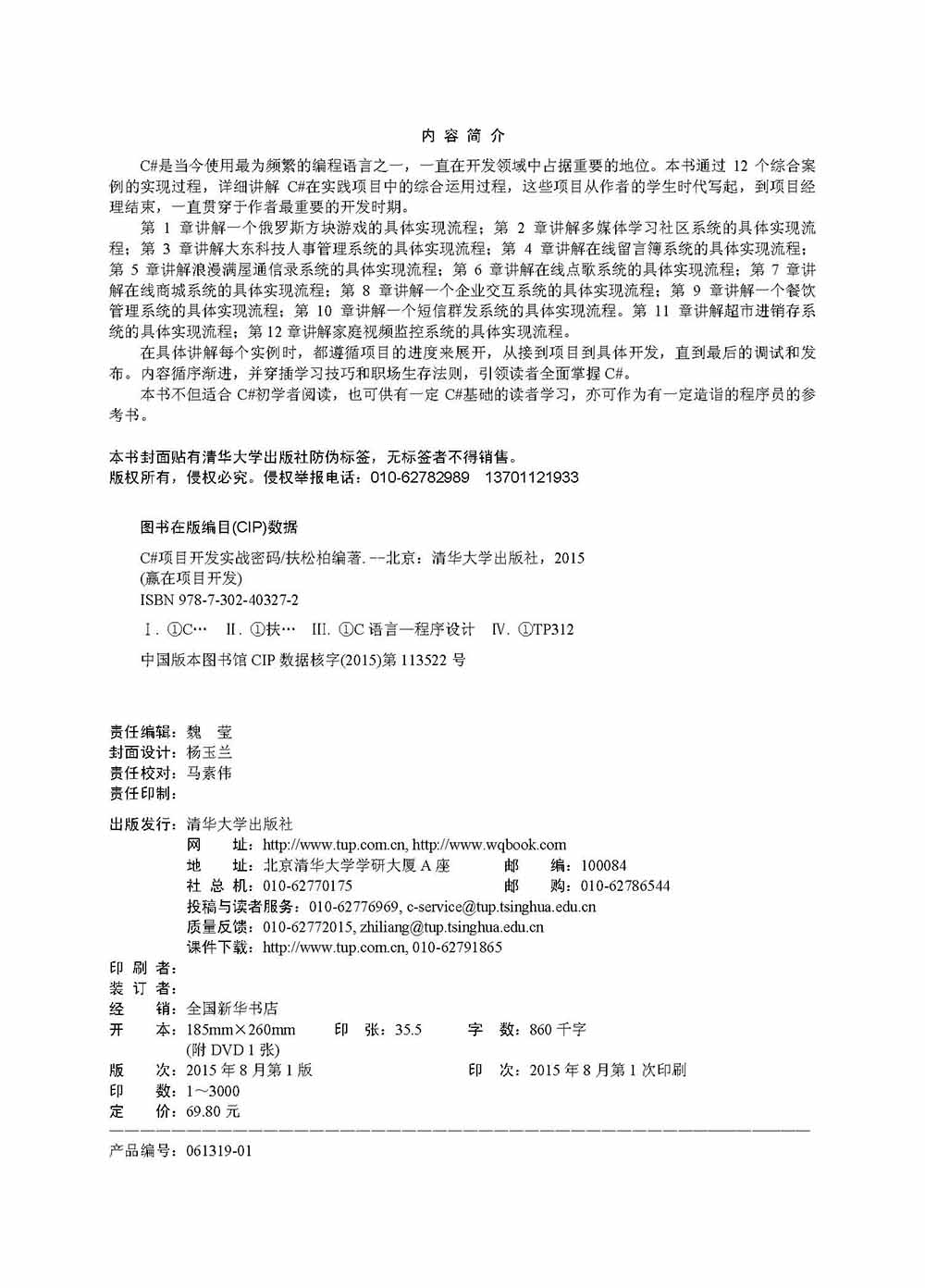 C#是当今使用最为频繁的编程语言之一,一直在开发领域中占据重要的地位。本书通过12个综合案例的实现过程,详细讲解C#在实践项目中的综合运用过程,这些项目从作者的学生时代写起,到项目经理结束,一直贯穿于作者最重要的开发时期。 第1章讲解一个俄罗斯方块游戏的具体实现流程;第2章讲解多媒体学习社区系统的具体实现流程;第3章讲解大东科技人事管理系统的具体实现流程;第4章讲解在线留言簿系统的具体实现流程;第5章讲解浪漫满屋通信录系统的具体实现流程;第6章讲解在线点歌系统的具体实现流程;第7章讲解在线商城系统的具体实现流程;第8章讲解一个企业交互系统的具体实现流程;第9章讲解一个餐饮管理系统的具体实现流程;第10章讲解一个短信群发系统的具体实现流程。第11章讲解超市进销存系统的具体实现流程;第12章讲解家庭视频监控系统的具体实现流程。 在具体讲解每个实例时,都遵循项目的进度来展开,从接到项目到具体开发,直到最后的调试和发布。内容循序渐进,并穿插学习技巧和职场生存法则,引领读者全面掌握C#。 本书不但适合C#初学者阅读,也可供有一定C#基础的读者学习,亦可作为有一定造诣的程序员的参考书。
