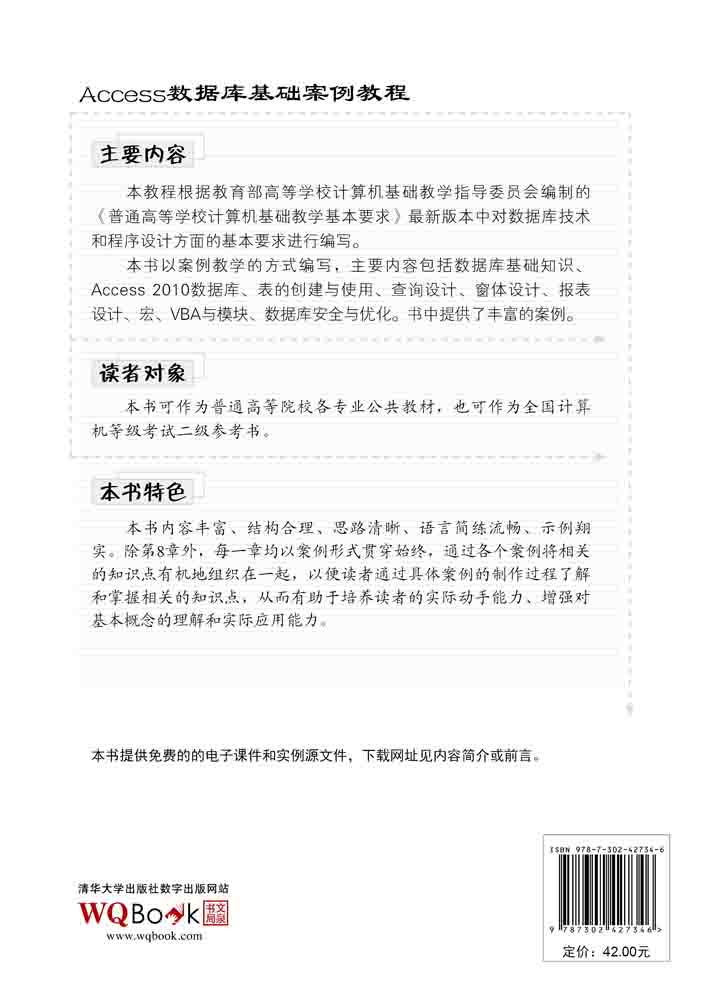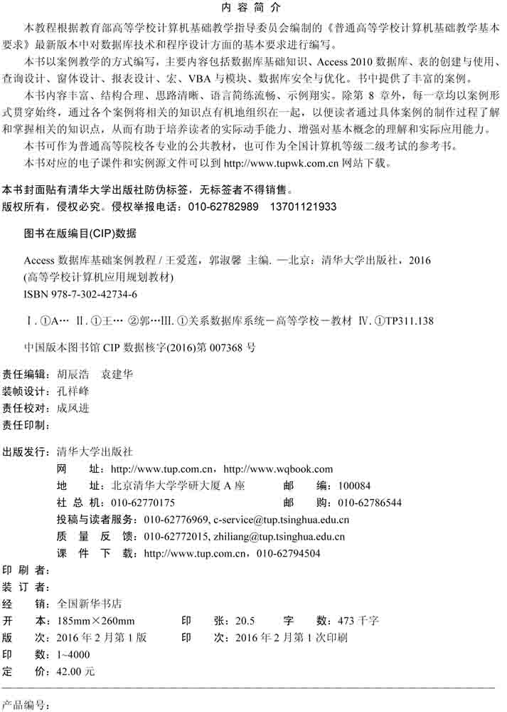 本教程根据教育部高等学校计算机基础教学指导委员会编制的《普通高等学校计算机基础教学基本要求》最新版本中对数据库技术和程序设计方面的基本要求进行编写。 本书以案例教学的方式编写,主要内容包括数据库基础知识、Access 2010数据库、表的创建与使用、查询设计、窗体设计、报表设计、宏、VBA与模块、数据库安全与优化。书中提供了丰富的案例。 本书内容丰富、结构合理、思路清晰、语言简练流畅、示例翔实。除第8章外,每一章均以案例形式贯穿始终,通过各个案例将相关的知识点有机地组织在一起,以便读者通过具体案例的制作过程了解和掌握相关的知识点,从而有助于培养读者的实际动手能力、增强对基本概念的理解和实际应用能力。 本书可作为普通高等院校各专业的公共教材,也可作为全国计算机等级二级考试的参考书。 本书对应的电子课件和实例源文件可以到http://www.tupwk.com.cn网站下载。