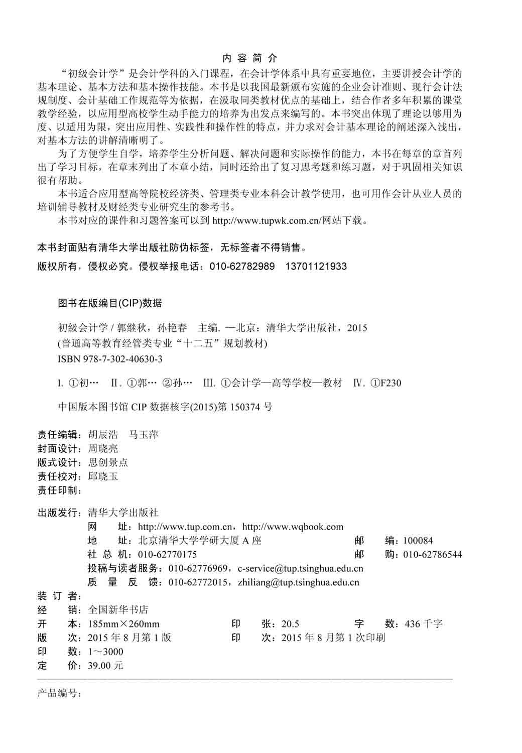 “初级会计学”是会计学科的入门课程,在会计学体系中具有重要地位,主要讲授会计学的基本理论、基本方法和基本操作技能。本书是以我国最新颁布实施的企业会计准则、现行会计法规制度、会计基础工作规范等为依据,在汲取同类教材优点的基础上,结合作者多年积累的课堂教学经验,以应用型高校学生动手能力的培养为出发点来编写的。本书突出体现了理论以够用为度、以适用为限,突出应用性、实践性和操作性的特点,并力求对会计基本理论的阐述深入浅出,对基本方法的讲解清晰明了。 为了方便学生自学,培养学生分析问题、解决问题和实际操作的能力,本书在每章的章首列出了学习目标,在章末列出了本章小结,同时还给出了复习思考题和练习题,对于巩固相关知识很有帮助。 本书适合应用型高等院校经济类、管理类专业本科会计教学使用,也可用作会计从业人员的培训辅导教材及财经类专业研究生的参考书。 本书对应的课件和习题答案可以到http://www.tupwk.com.cn/网站下载。