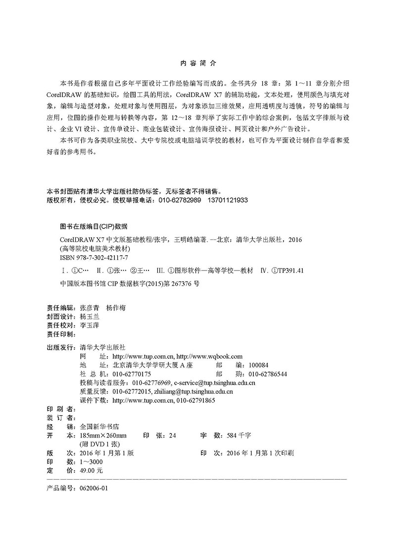 本书是作者根据自己多年平面设计工作经验编写而成的。全书共分18章:第1~11章分别介绍CorelDRAW的基础知识,绘图工具的用法,CorelDRAW X7的辅助功能,文本处理,使用颜色与填充对象,编辑与造型对象,处理对象与使用图层,为对象添加三维效果,应用透明度与透镜,符号的编辑与应用,位图的操作处理与转换等内容,第12~18章列举了实际工作中的综合案例,包括文字排版与设计、企业VI设计、宣传单设计、商业包装设计、宣传海报设计、网页设计和户外广告设计。 本书可作为各类职业院校、大中专院校或电脑培训学校的教材,也可作为平面设计制作自学者和爱好者的参考用书。