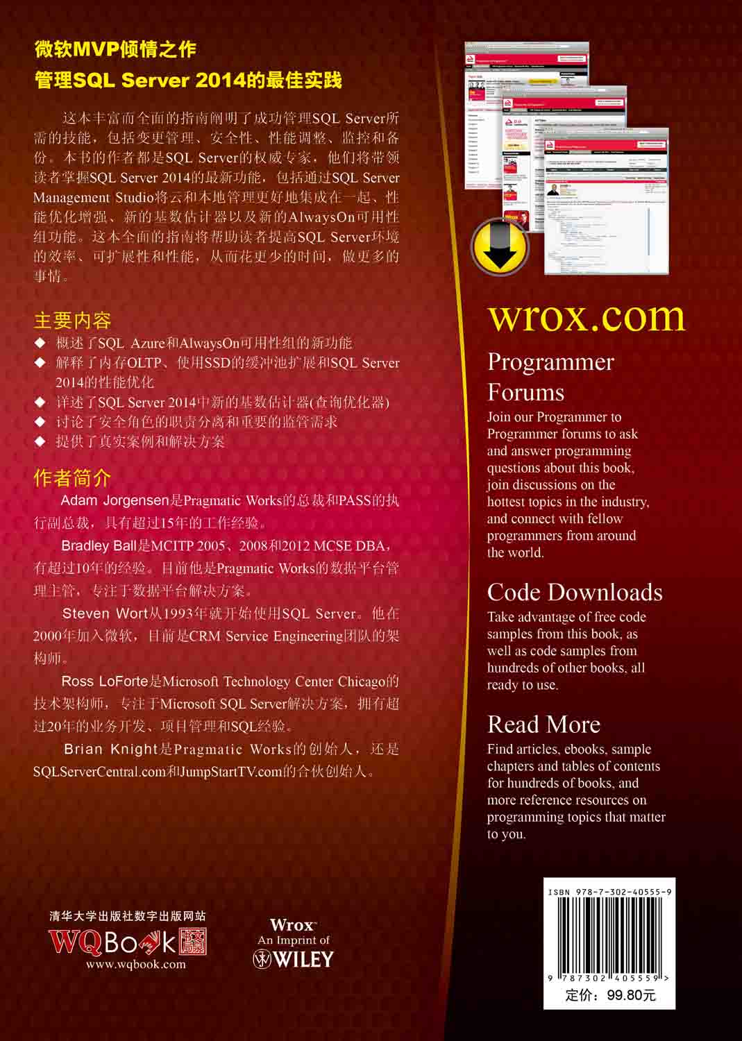 Adam Jorgensen是一位全球认可、并得到奖项认证的专家,在关注增长的全球性组织中获得了成功。他目前关注的是帮助客户形成一种数据文化,通过合适的分析解决方案来识别、分析和推动业务机会。Jorgensen还负责Pragmatic Works的战略和运营,并且是PASS(世界最大的数据从业人员的组织)的执行副总裁和理事。这两个组织都通过数据驱动的视角,帮助数据从业人员用更新、更强大的方式来更好地完成自己的工作。 Bradley Ball是一位微软认证IT专家(MCITP) 2005和2008 DBA,有超过15年的经验。Bradley做过8年的美国国防部承包商,客户包括美国陆军、美国总统办事机构和大众超级市场。目前,他是Pragmatic Works的数据平台管理部门主管,专攻数据平台解决方案。Bradley是微软虚拟技术解决方案专家(VTSP),帮助微软交付技术解决方案、对问题进行故障排除以及推广Microsoft SQL Server。他在多个场合做过演讲,包括SQL Saturdays、整个美国的PASSSQLServer用户组(SSUG)、SQL Rally、DevConnections、SQL Live 360和PASS Summit 2011、2012和2013。目前他住在中佛罗里达,并在http://www.sqlballs.com撰写关于SQL Server和他感兴趣的其他一些内容的文章。 Steven Wort从1993年就开始使用SQL Server,当时使用的是运行在OS 2上的4.2版本。他有超过30年的应用程序开发经验。在2000年,Steven加入了微软,担任Systems Integration Engineering(SIE)团队的专家级工程师,并与人合办了多个关于Windows和.NET调试的学习班。在2004年,他转到SQLServer产品小组研究SQLServer 2005的可扩展性。之后他转到Windows部门,负责扩展大型数据系统。后来,Steven回到了SQL Server产品部门,负责构建SQL Server Appliance。目前他是CRM Service Engineering团队的架构师,关注SQL Server的性能和可扩展性。Steven参与撰写了几本关于SQL Server管理、故障排除和性能调整的图书。 Ross LoForte是Microsoft Technology Center Chicago的技术架构师,主要致力于Microsoft SQL Server解决方案。Ross有20年以上从事业务开发、项目管理以及设计SQL解决方案的经验。过去13年里,Ross在MicrosoftTechnology Center工作,为微软最大的战略性客户设计企业级的关键任务SQL Server解决方案。Ross在芝加哥DePaul大学讲授SQL Server,还经常在SQL Saturday、TechEd、SQL PASS、Gartner、TDWI及Microsoft内部会议上演讲。Ross出版过著作,并且也是SQLServer专业协会、芝加哥SQLServer用户组及其他SQLServer社区的积极参与者。 Brian Knight是Pragmatic Works公司的创始人和共有人,也是一名企业家,创办了其他一些公司。Brian是多本技术杂志的专栏作家,并经常发表Web讲座。他共撰写了超过15本技术书籍。Brian参加过许多会议,如PASS、SQL Connections、TechEd以及众多Code Camp。他收获了不少荣誉,包括Business Ambassador Award(主席奖)和Top CEO(Jacksonville杂志)。可以在http://www. bidn.com找到他的博客。