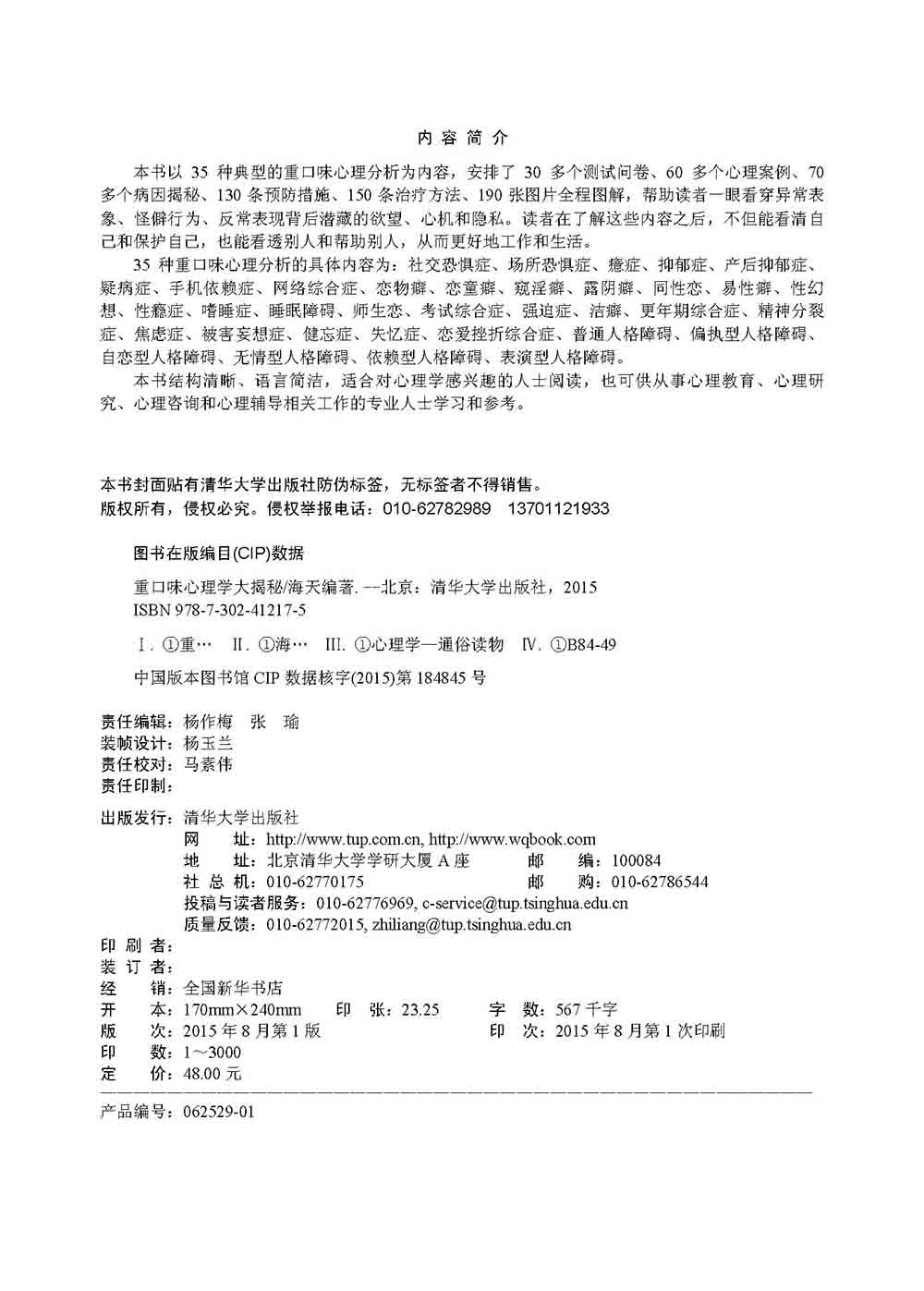 本书以35种典型的重口味心理分析为内容,安排了30多个测试问卷、60多个心理案例、70多个病因揭秘、130条预防措施、150条治疗方法、190张图片全程图解,帮助读者一眼看穿异常表象、怪僻行为、反常表现背后潜藏的欲望、心机和隐私。读者在了解这些内容之后,不但能看清自己和保护自己,也能看透别人和帮助别人,从而更好地工作和生活。 35种重口味心理分析的具体内容为:社交恐惧症、场所恐惧症、癔症、抑郁症、产后抑郁症、疑病症、手机依赖症、网络综合症、恋物癖、恋童癖、窥淫癖、露阴癖、同性恋、易性癖、性幻想、性瘾症、嗜睡症、睡眠障碍、师生恋、考试综合症、强迫症、洁癖、更年期综合症、精神分裂症、焦虑症、被害妄想症、健忘症、失忆症、恋爱挫折综合症、普通人格障碍、偏执型人格障碍、自恋型人格障碍、无情型人格障碍、依赖型人格障碍、表演型人格障碍。 本书结构清晰、语言简洁,适合对心理学感兴趣的人士阅读,也可供从事心理教育、心理研究、心理咨询和心理辅导相关工作的专业人士学习和参考。