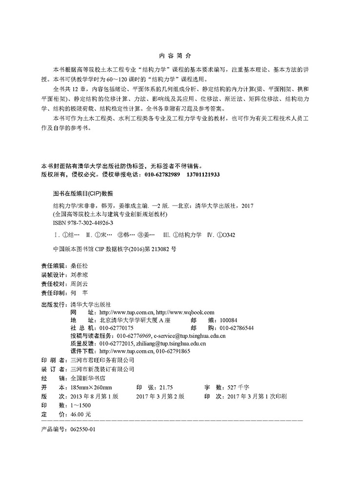 前 言 本书是为普通高等院校土木工程类各专业及工程力学等专业中多学时结构力学课程的教学而编写的。 根据对21世纪进行素质教育和创新意识培养的要求,本书适当降低了对结构力学深度和难度的要求,更加注重于基本理论、基本方法和基本计算的训练。本书内容的选取借鉴了国内的优秀教材,其特点为注重基础训练,淡化纯理论推导,注重公式物理意义的讲解和基本方法的学习和掌握。 本书共12章,采用了最新国家标准。本次再版对原版的某些重点章节进行了修订,使其力学概念更加清晰准确。 本书由吉林建筑大学宋非非、长春工程学院设计研究院韩芳、吉林建筑大学姜维成担任主编,浙江建效工程监理有限公司甄颂、浙江建设职业技术学院宋平、中国建筑第二工程局有限公司北京分公司董亚兴担任副主编,宋平同时担任主审。具体编写分工如下:第1、2、8章由宋非非、董亚兴编写,第3、6章由韩芳编写,第4、5、7章由宋平编写,第9、10、11、12章由姜维成、甄颂编写。全书由宋非非、姜维成负责统稿。 由于编者水平有限,不妥之处在所难免,希望广大读者批评指正,以利于本书的进一步完善和提高。 编 者