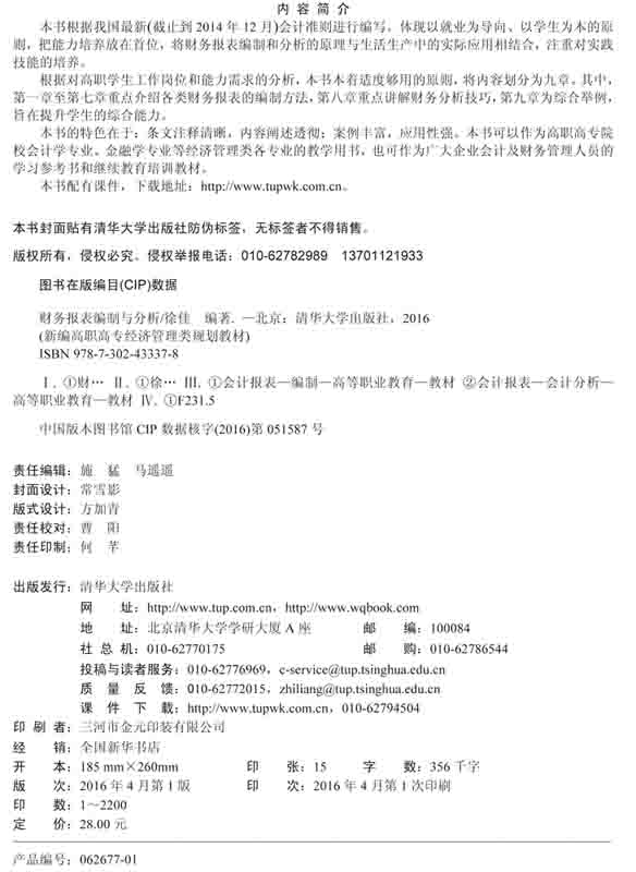 本书根据我国最新(截止到 2014 年 12 月)会计准则进行编写。体现以就业为导向、以学生为本的原则,把能力培养放在首位,将财务报表编制和分析的原理与生活生产中的实际应用相结合,注重对实践技能的培养。 根据对高职学生工作岗位和能力需求的分析,本书本着适度够用的原则,将内容划分为九章。其中,第一章至第七章重点介绍各类财务报表的编制方法,第八章重点讲解财务分析技巧,第九章为综合举例,旨在提升学生的综合能力。 本书的特色在于:条文注释清晰,内容阐述透彻;案例丰富,应用性强。本书可以作为高职高专院校会计学专业、金融学专业等经济管理类各专业的教学用书,也可作为广大企业会计及财务管理人员的学习参考书和继续教育培训教材。 本书配有课件及课后习题答案,下载地址:http://www.tupwk.com.cn。