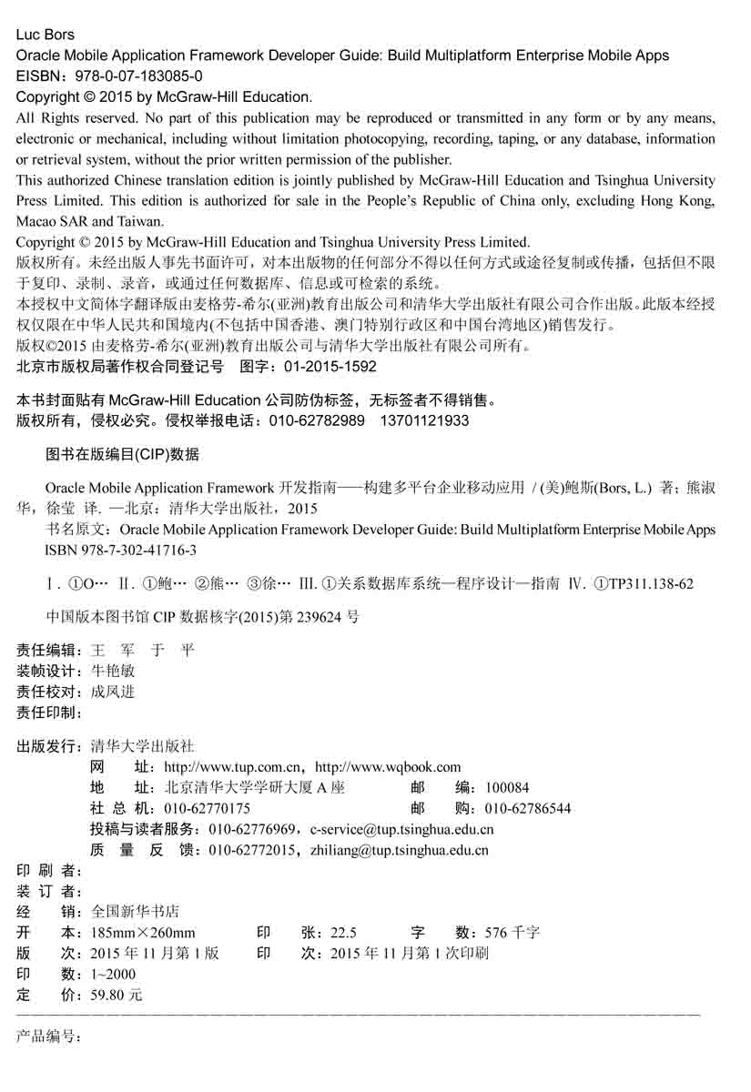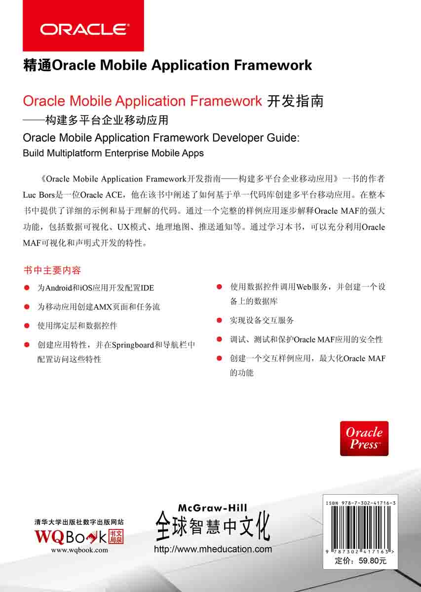《Oracle Mobile Application Framework开发指南——构建多平台企业移动应用》一书的作者Luc Bors是一位Oracle ACE,他在该书中阐述了如何基于单一代码库创建多平台移动应用。在整本书中提供了详细的示例和易于理解的代码。通过一个完整的样例应用逐步解释Oracle MAF的强大功能,包括数据可视化、UX模式、地理地图、推送通知等。通过学习本书,可以充分利用Oracle MAF可视化和声明式开发的特性。 书中主要内容 ● 为Android和iOS应用开发配置IDE ● 为移动应用创建AMX页面和任务流 ● 使用绑定层和数据控件 ● 创建应用特性,并在Springboard和导航栏中配置访问这些特性 ● 使用数据控件调用Web服务,并创建一个设备上的数据库 ● 实现设备交互服务 ● 调试、测试和保护Oracle MAF应用的安全性 ● 创建一个交互样例应用,最大化Oracle MAF的功能