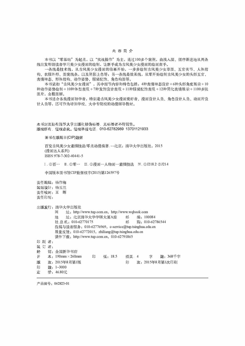 本书以“零基础”为起点,以“实战操作”为主,通过100多个案例,由浅入深、循序渐进地从两条线出发帮助读者学习美少女漫画的绘制,让新手成为古风美少女漫画的绘画高手。 一条线是技术线,从古风美少女漫画的临摹开始,一步步绘制古风美少女草图、五官关节、人体结构、衣服外形、图案线条,以及阴影上色等;另一条线是效果线,从零开始绘制古风美少女的头部五官、表情神态、形体结构、动作姿势、服装配饰、角色构图等。 本书紧扣“古风美少女漫画”,其中细节内容和特色包括:4种表情神态设计+6种头部角度展示+10种动作姿势绘制+10种体型表现+7种发饰设计表现+11种服装配饰表现+12种简化表情展示+1100多张图片,全程图解。 本书适合各类漫画初学者,特别是古风美少女漫画爱好者、漫画设计人员、角色设计人员、动画片设计人员等,还可作为培训学校、大中专院校的动漫辅导教材。