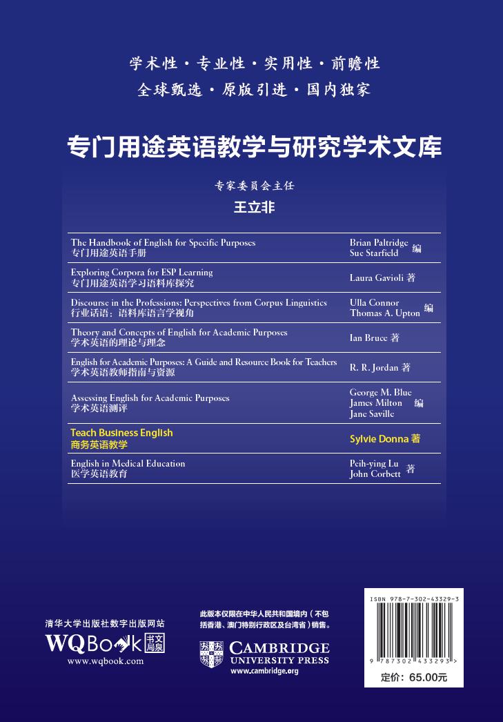本书作者Sylvie Donna是英国著名高校杜伦大学英语语言中心的知名学者,教授的课程主要有专门用途英语、学术英语、通用英语等,曾获得英国杜伦大学学习和教学卓越奖。本书旨在为从事商务英语教学的教师提供全面和综合的介绍、指导和启发。全书涉及商务英语教学的诸多方面,如需求分析、课程计划、课程设置和教学测评。本书的视角是实践性的,强调实用,大部分内容都着眼于课堂教学过程,包括国际商务环境中的大量听、说、读、写教学活动,因此对于指导教学实践大有裨益。全书分为十章,每章由若干小节组成,每小节的前半部分主要阐述教学理论和步骤,后半部分则介绍教学方法和活动。本书最后提供了词汇表,以便初学者查询生词,索引部分则旨在帮助读者找到相关机构、资源和测试。 本书对于刚进入商务英语教学领域的教师是很好的学习手册,对已有一定经验的商务英语教师也能提供极大的启发和指导。