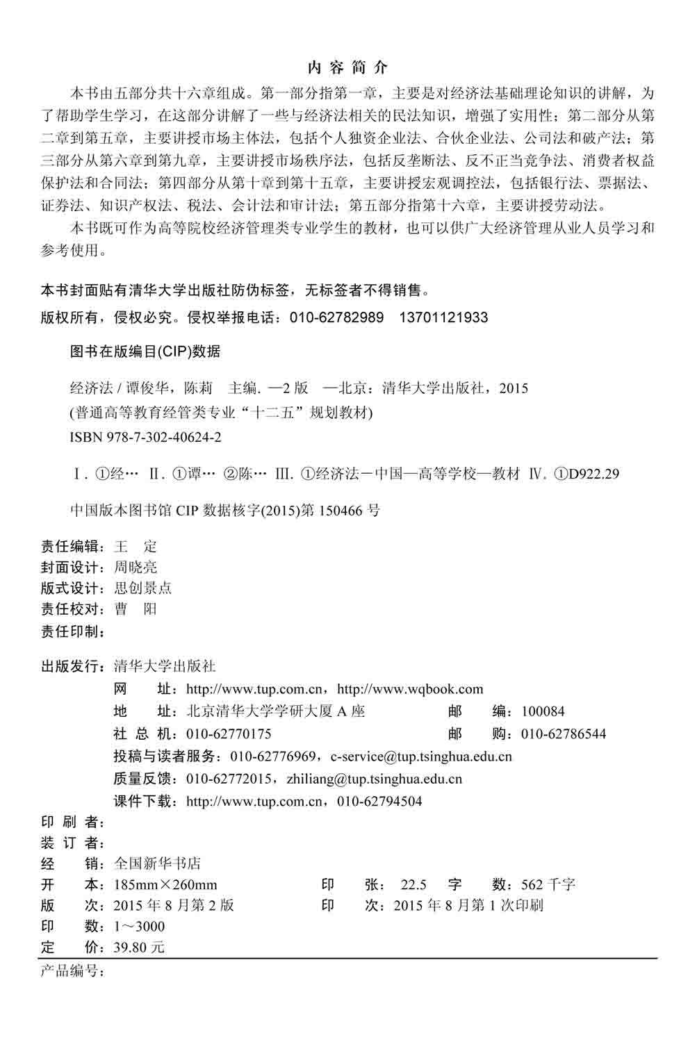 本书由五部分共十六章组成。第一部分指第一章,主要是对经济法基础理论知识的讲解,为了帮助学生学习,在这部分讲解了一些与经济法相关的民法知识,增强了实用性;第二部分从第二章到第五章,主要讲授市场主体法,包括个人独资企业法、合伙企业法、公司法和破产法;第三部分从第六章到第九章,主要讲授市场秩序法,包括反垄断法、反不正当竞争法、消费者权益保护法和合同法;第四部分从第十章到第十五章,主要讲授宏观调控法,包括银行法、票据法、证券法、知识产权法、税法、会计法和审计法;第五部分指第十六章,主要讲授劳动法。 本书既可作为高等院校经济管理类专业学生的教材,也可以供广大经济管理从业人员学习和参考使用。