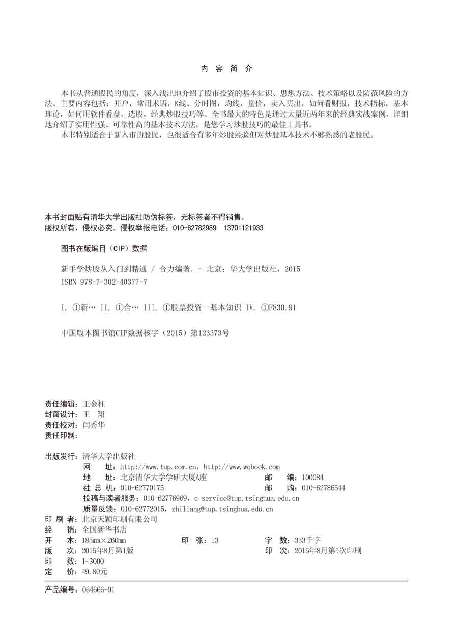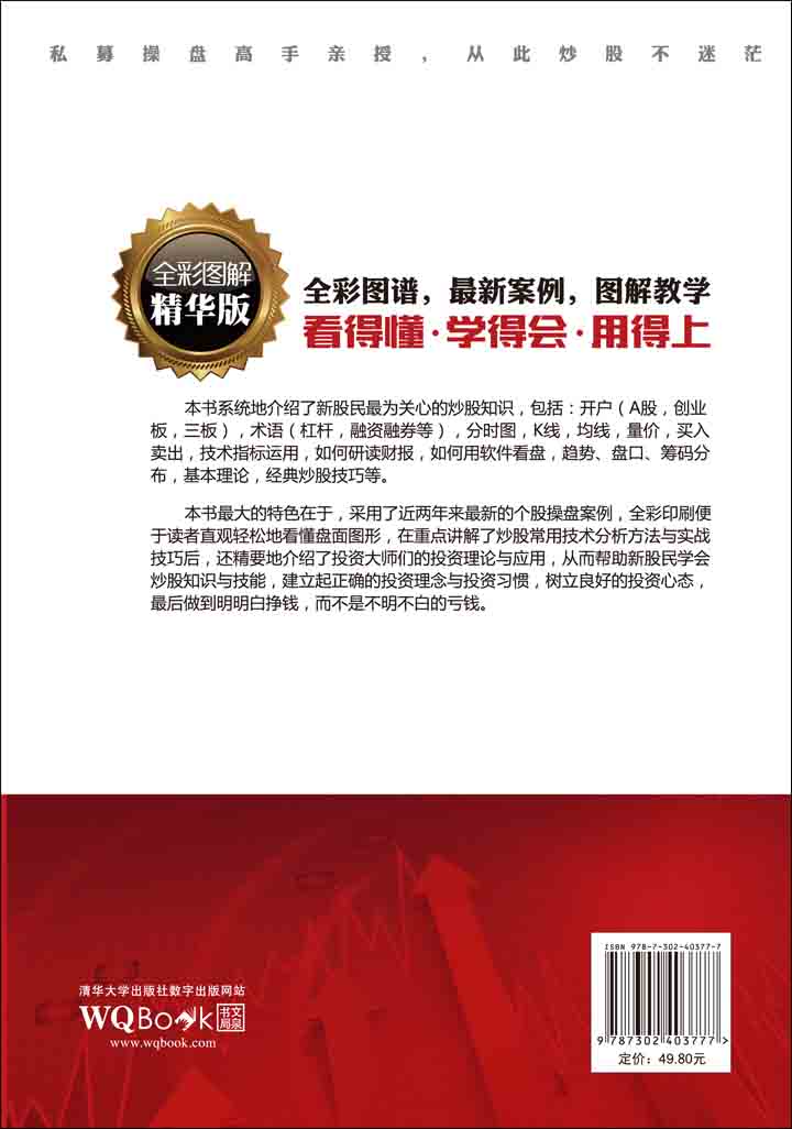 自2014年下半年起,我国股市再次进入了牛市行情。众多股票都在短期内大幅上涨,翻倍的股票俯首皆是,翻十倍的股票也不在少数。在这种赚钱效应的影响下,大量新手进入股市,很多上次牛市结束之后就没再炒股的老手也再次开启了自己尘封的账户。新一轮全民炒股的时代已经开启。 不过,炒股是一项技术含量很高的工作。投资者仅凭热情没办法在这个市场赚到钱。要想炒股赚钱,你必须要耐下心来,暂时压抑赚钱的冲动,好好学习一下炒股的知识。本书就是一本为新投资者系统讲解各种炒股知识的入门类书籍。 这本书专门献给那些怀揣梦想进入股市,想要通过不断磨练自己学会高超炒股技术,最终在股市取得成功的投资者。 如果你自认为投入股市的资金很少,盈亏无所谓,只是把炒股当成一种娱乐,作为茶余饭后的谈资,那么就不用看这本书了。这本书只写给那些想要把炒股当成一项重要事业的投资者。 如果你想不劳而获,以为看一本书就能找到不传世的交易秘籍,把股市变成提款机,那么也不用看这本书了。本书只写给那些想要勤学苦练,在不断磨练中并提高自己交易技术的投资者。 如果你迷信市场上的各种股神和荐股信息,以为跟对了高手操作就能凭借别人的荐股发财,那么同样不用看这本书了。本书只写给那些想要提高自己的交易技术,把自己磨练成高手的投资者。 最后为阅读本书的投资者提一点建议。在读完本书之前,凡是交易时你最好多想一点。这时你的炒股知识还不完备,多想一点就少一点亏损的可能,可以在股市上多活几天。在读完本书之后,你最好尽量多做一点交易。这本书里已经讲了你在炒股过程中所需要用到的各种知识。将它们都学会之后,你要做的就是将其运用到实战中不断磨练,最终变成自己的交...