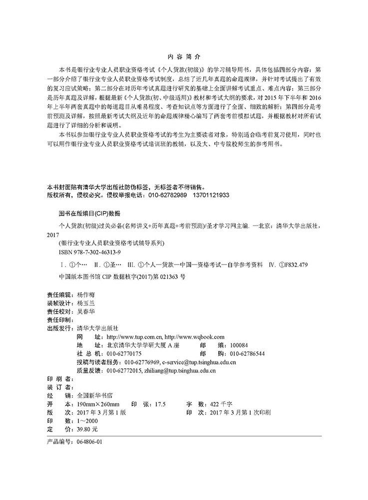 "本书是银行业专业人员职业资格考试《个人贷款(初级)》的学习辅导用书,具体包括四部分内容:第一部分介绍了银行业专业人员职业资格考试制度,总结了近几年真题的命题规律,并针对考试提出了有效的复习应试策略;第二部分在对历年考试真题进行研究的基础上全面讲解考试重点、难点内容;第三部分是历年真题及详解,根据最新《个人贷款(初、中级适用)》教材和考试大纲的要求,对2015年下半年和2016年上半年两套真题中的每道题目从难易程度、考查知识点等方面进行了全面、细致的解析;第四部分是考前预测及详解,按照最新考试大纲及近年的命题规律精心编写了两套考前模拟试题,并根据教材对所有试题进行了详细的分析和说明。 本书以参加银行业专业人员职业资格考试的考生为主要读者对象,特别适合临考前复习使用,同时也可以用作银行业专业人员职业资格考试培训班的教辅,以及大、中专院校师生的参考用书。 "