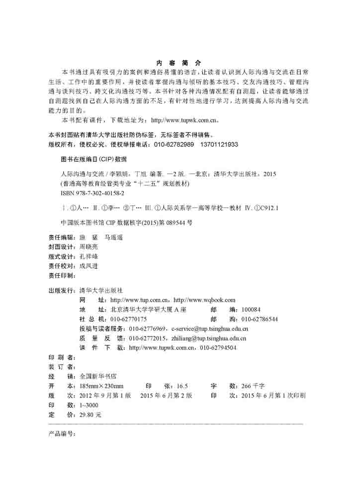 本书通过具有吸引力的案例和通俗易懂的语言,让读者认识到人际沟通与交流在日常生活、工作中的重要作用,并使读者掌握沟通与倾听的基本技巧、交友沟通技巧、管理沟通与谈判技巧、跨文化沟通技巧等。本书针对各种沟通情况配有自测题,让读者能够通过自测题找到自己在人际沟通方面的不足,有针对性地进行学习,达到提高人际沟通与交流能力的目的。 本书配有课件,下载地址为:http://www.tupwk.com.cn。