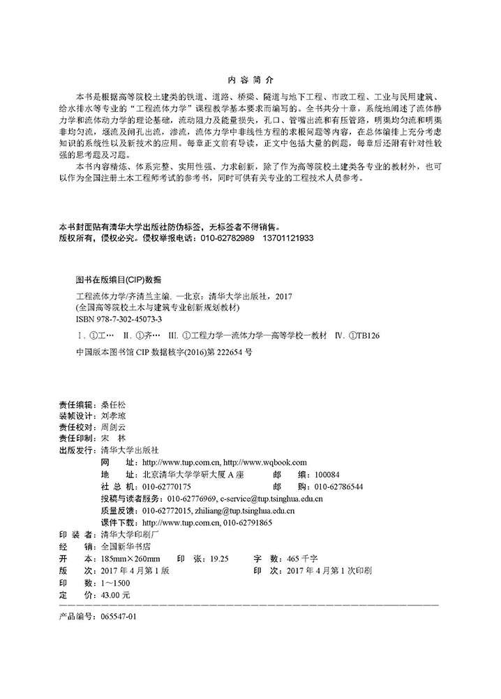本书是根据高等学校土建类的铁道、道路、桥梁、隧道与地下工程、市政工程、工业与民用建筑、给水排水等专业的工程流体力学课程教学基本要求而编写的。本书坚持基本理论必需、够用为度,突出重点、难点和讲究实用。在总体编排上考虑知识的系统全面,而在知识点的介绍上又有相对的独立性,语言通俗易懂,例证丰富。主要特点如下。1. 遵循必需、够用的原则搭建最基础的理论体系,以能够满足一般的实际工程需要为基本宗旨。传统教材中有些理论性较强的内容与实际工程应用联系不密切,例如三维流体平衡微分方程、N-S方程等,这些内容过于理论化,对于土建类的本科生不需要进一步学习。2. 坚持简明推导的原则本教材的理论推导部分均用最简明直接的形式导出,更加通俗易懂,便于掌握。传统教材的知识体系大都建立在三元流基础之上,因此一些基本方程式的推导也必须由三元流入手,例如,传统教材中流体静力学基本方程由三维流体平衡微分方程导出,而本教材是直接由柱状隔离体的平衡关系导出。3. 科学设计学习体系每章之前有导读,可帮助读者理清本章学习内容与前后章节的关系以及本章的知识脉络,把握本章的重点、难点内容。每章后有大量的思考题和习题,思考题和习题不只局限于对基础理论的简单理解,更侧重于理论联系实际,进一步培养学习者用基本理论解决实际工程问题的能力。4. 引入MATLAB数值计算方法传统教材只介绍用图解法和试算法解决复杂的高次方程求解问题,过程烦琐且精度较低。MATLAB作为一个高效的数值计算平台被引入到本书中,实现了理论计算与数值计算的对接。本书共分九章,内容包括绪论,流体静力学,流体动力学理论基础,流动阻力及能量损失,孔口、管嘴出流和有压管路,明渠均匀流,明渠非均匀流,堰流,渗流。每章正文前有导读,除正文中包括大量的例题外,每章后都附有针对性较强的思考题及习题。