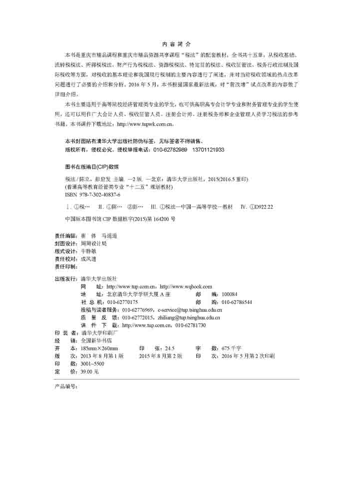 本书是重庆市精品课程和重庆市精品资源共享课程“税法”的配套教材,全书共十五章,从税收基础、流转税税法、所得税税法、财产行为税税法、资源税税法、特定目的税法、税收征管法、税务行政法制及国际税收等方面,对税收的基本理论和我国现行税制的主要内容进行了阐述,并对当前税收领域的热点改革问题进行了必要的介绍和分析。2016年5月,本书根据国家最新法规,对“营改增”试点改革的内容做了详细介绍。 本书主要适用于高等院校经济管理类专业的学生,也可供高职高专会计学专业和财务管理专业的学生使用,还可以用作广大会计人员、税收征管人员、注册会计师、注册税务师和企业管理人员学习税法的参考书籍。本书课件下载地址:http://www.tupwk.com.cn。