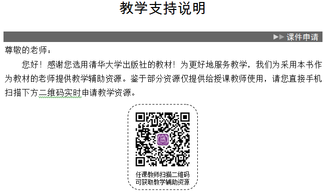感谢您选用清华大学出版社的教材!我们为采用本书作为教材的老师提供教学辅助资源。请点击 资源下载—课件下载 扫描二维码 下载教学资源。如有疑问请致电010-8347(0332)/(0142)