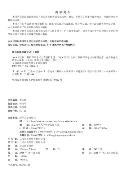 本书严格依据最新颁布的《全国计算机等级考试大纲》编写,并结合了历年考题的特点、考题的分布和解题的方法。 本书具体内容包括10套全真模拟,涵盖考试的上机选择题、程序填空题、程序改错题和程序设计题,本书最后给出了每道考题的答案和解析。 本书适合报考全国计算机等级考试“二级C语言”科目的考生选用,也可作为大中专院校相关专业的教学辅导用书或相关培训课程的辅导教材。