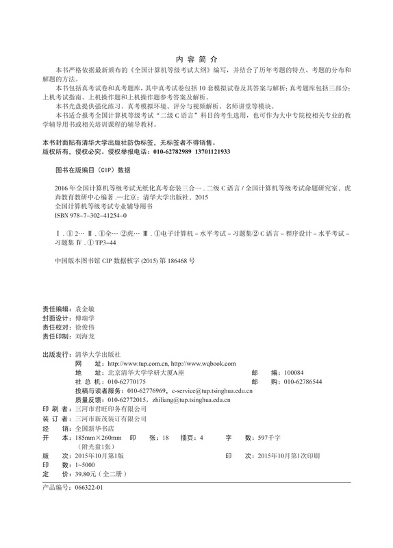 本书严格依据最新颁布的《全国计算机等级考试大纲》编写,并结合了历年考题的特点、考题的分布和解题的方法。 本书包括真考试卷和真考题库,其中真考试卷包括10套模拟试卷及其答案与解析;真考题库包括三部分:上机考试指南、上机操作题和上机操作题参考答案及解析。 本书光盘提供强化练习、真考模拟环境、评分与视频解析、名师讲堂等模块。 本书适合报考全国计算机等级考试“二级C语言”科目的考生选用,也可作为大中专院校相关专业的教学辅导用书或相关培训课程的辅导教材。