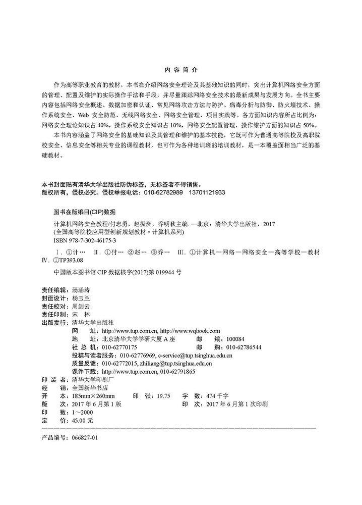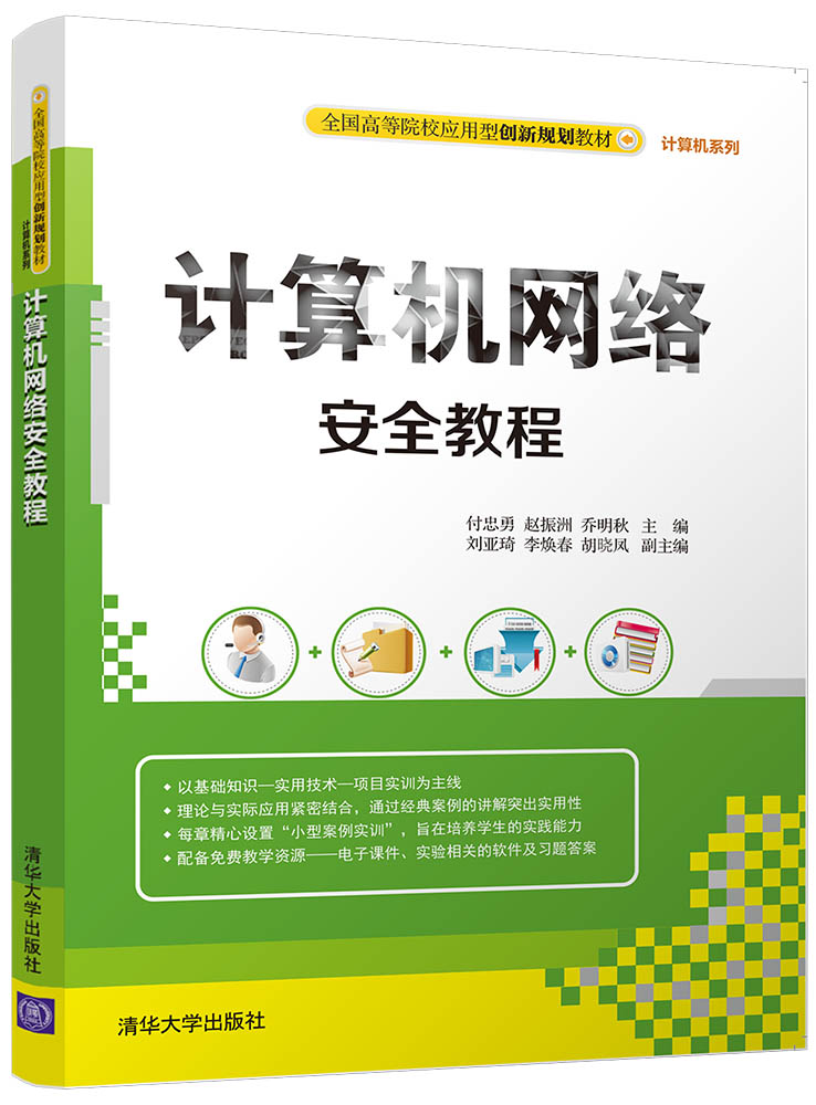 本书内容特色体现在以下3个方面:①通俗易懂。计算机网络的技术性很强,网络安全技术本身也比较晦涩难懂,本书力求以通俗的语言和清晰的叙述方式,向读者介绍计算机网络安全的基本理论、基本知识和实用技术。②突出实用。通过阅读本书,读者可掌握计算机网络安全的基础知识,并了解设计和维护网络及其应用系统安全的基本手段和方法。本书在编写形式上突出了应用的需求,每一章的理论内容都力求结合实际案例进行教学,第10章还设计了与前述章节内容配套的实训方案,从而为教学和自主学习提供了方便。③选材新颖。计算机应用技术和网络技术的发展是非常迅速的,本书在内容组织上力图靠近新知识、新技术的前沿,以使本书能较好地反映新理论和新技术。