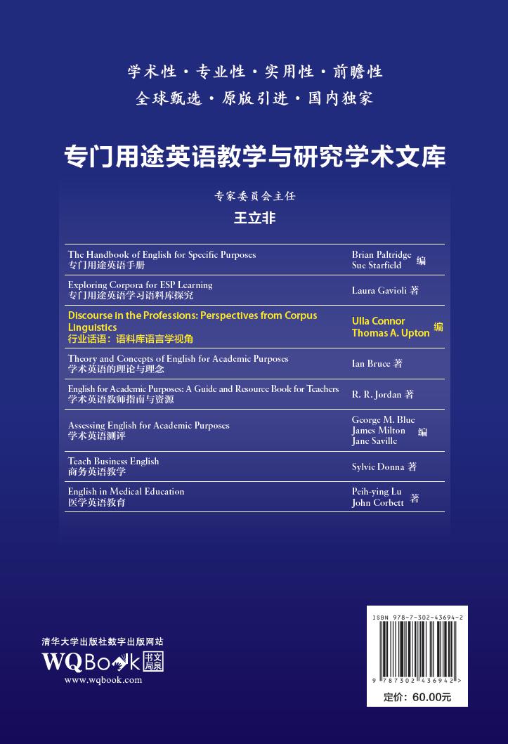 本书分为四大部分:第一部分阐述专用语料库的概念、发展、趋势和建设;第二部分通过基于语料库的分析方法,探讨学术用语的程式化表达方式及其在不同体裁、学科之间的差异;第三部分的研究主要涉及商务口语及法律话语;第四部分主要针对某一特定语料库,从多个角度进行研究,为语料库的量化和质化分析提供新思路。全书从语料库语言学的角度,对学术和行业话语的结构和使用进行了探索,旨在阐明语料库语言学的分析结果是如何帮助我们更好地理解学术和行业语言的使用方法的,并且从行业英语教育的层面帮助我们找到更好的方法来培训新入行者,使其了解不同行业语境中使用的语言种类和特点。 本书能为EFL教师(母语或二语)、ELT/ESP教师和应用语言学者的教学与科研提供启示。