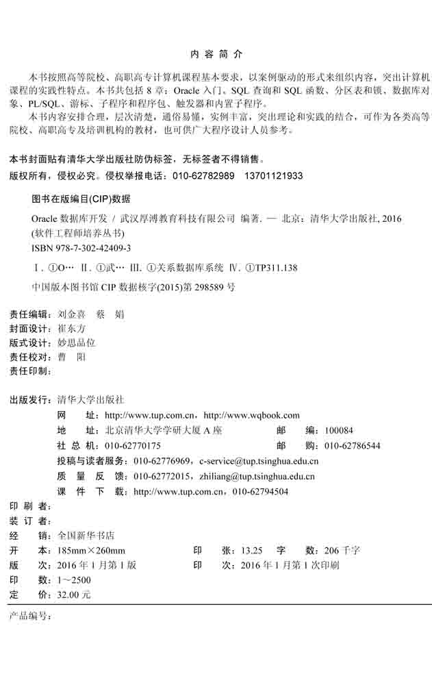 前 言 Oracle数据库系统是美国Oracle(甲骨文)公司提供的以分布式数据库为核心的一组软件产品,是目前最流行的客户/服务器(Client/Server)或浏览器/服务器(Browser/Server)体系结构的数据库之一。Oracle数据库是目前世界上使用最为广泛的数据库管理系统,作为一个通用的数据库系统,它具有完整的数据管理功能;作为一个关系数据库,它是一个关系完备的产品;作为分布式数据库它具有分布式处理功能。 本书隶属于“软件工程师培养丛书”中的一本专业教材,该丛书是由武汉厚溥教育科技有限公司开发,以培养符合企业需求的软件工程师应用开发、实施为目标的IT职业教育丛书。在开发该丛书之前,我们对IT行业的岗位序列做了充分的调研,包括研究从业人员技术方向、项目经验和职业素质等方面的需求,通过对所面向学生的特点、行业需求的现状以及实施等方面的详细分析,结合我公司对软件人才培养模式的认知,按照软件专业总体定位要求,进行软件专业产品课程体系设计。该丛书集应用软件知识和多领域的实践项目于一体,着重培养学生的熟练度、规范性、集成和项目能力,从而达到预定的培养目标。 本书共包括8章:Oracle入门、SQL查询和SQL函数、分区表和锁、数据库对象、PL/SQL、游标、子程序和程序包、触发器和内置子程序。 我们对本书的编写体系做了精心的设计,按照“理论学习—知识总结—上机操作—课后习题”这一思路进行编排。“理论学习”部分描述通过本案例要达到的学习目标与涉及的相关知识点,使学习目标更加明确;“知识总结”部分概括案例所涉及的知识点,使知识点完整系统地呈现;...