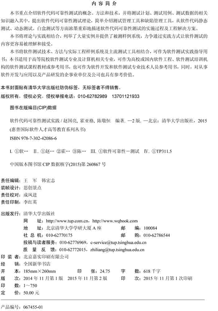 本书重点介绍软件代码可靠性测试的概念、方法和技术,并将测试计划、测试用例、测试数据的相关知识融入其中,提出软件代码可靠性测试理论,简单介绍测试管理工具和缺陷管理工具,从软件代码静态测试、动态测试、白盒测试等方面浓墨重彩地描述软件代码可靠性测试的实施过程及工程解决方案。 本书将理论与实践相结合,列举了大量实例并提供了被测样例系统,力争通过实践方式让软件测试的内容更容易被理解和接受。 本书将软件测试技术、方法与实际工程样例系统及主流测试工具相结合,可作为软件测试实践指导用书;本书适用于高等院校软件测试专业及计算机相关专业,可作为高校或国内软件工程、软件测试培训机构的软件测试课程教材或参考用书,也可作为软件开发和软件测试专业技术人员参考用书,同时,对从事软件开发与应用以及产品研发的企事业单位及公司也具有参考价值。