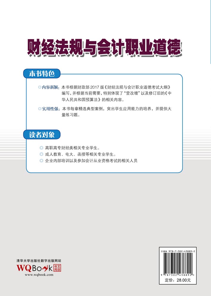 本书具有以下显著特点:(1) 内容新颖。本书根据财政部2017版《财经法规与会计职业道德考试大纲》精心编写各章内容,特别体现了营业税改增值税(以下简称“营改增”)最新立法信息以及《中华人民共和国预算法》的最新变化,使教学内容更贴近会计工作实际需要。(2) 实用性强。以实际财务工作对会计人员财经法规知识与会计职业道德的要求为依据,充分关注历年考试内容及最新考纲变化,精选知识内容,大量使用实际典型案例,兼顾考取从业资格证的同时,突出学生应用能力的培养。(3) 突出“教、学、做”一体化。本书在每章内容之前都有基本要求和内容摘要,以理解与应用能力培养为主线,专门安排案例分析章节,每章后均附有大量的练习题和案例分析题,强化学生对财经法规的理解与应用。每一项内容都经过精心编排,可操作性强,力求学以致用。(4) 紧扣大纲,指导性强。本书编者具有多年从事会计从业资格考试辅导和命题工作的经验,教材根据最新大纲编写,结构内容与大纲基本一致,并且考虑了会计行业入门者上岗时所必备的技能,力争将本书打造成为优秀的教材。(5) 体现会计专业特色,语言简练,深入浅出。本书充分考虑了高职高专学生及会计初学者的实际情况,所以尽可能用通俗、简明的语言将会计专业的特点描述出来,讲解深刻,覆盖面广。
