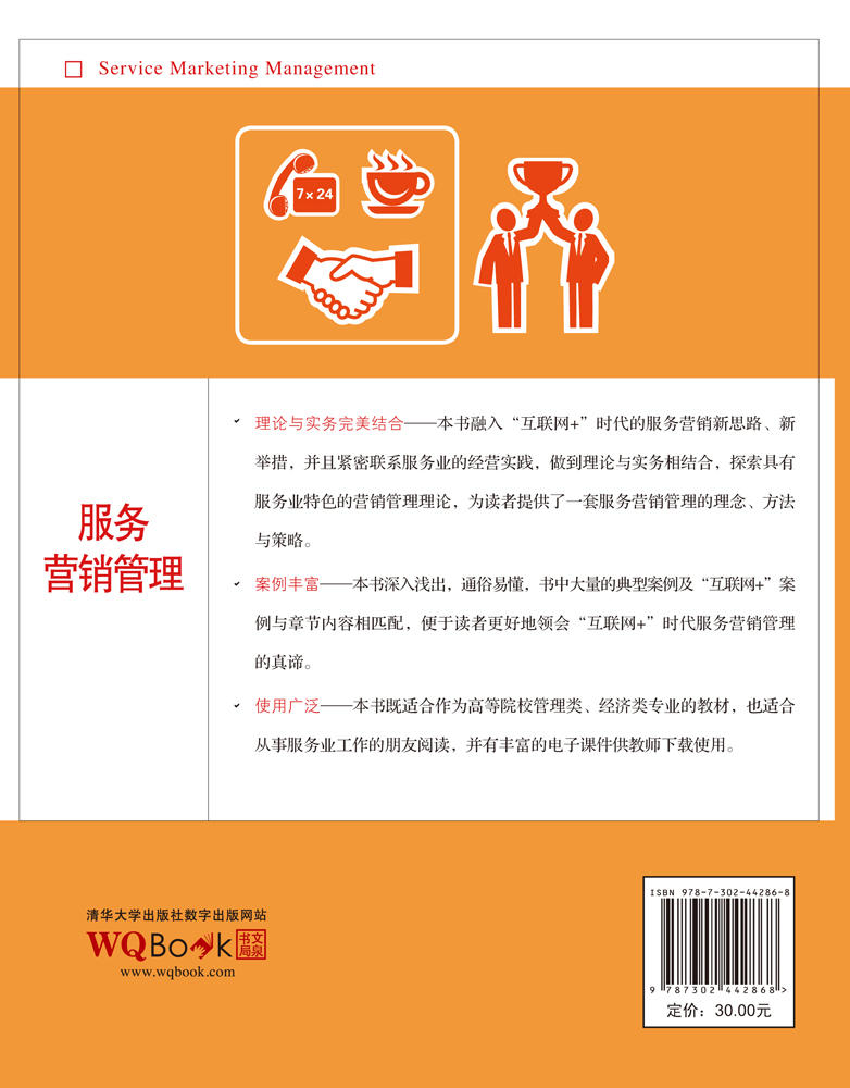本书借鉴和吸收了国内外服务营销管理理论的最新成果,融入了“互联网+”时代的新思路、新举措,阐述了服务产品策略、服务定价策略、服务分销策略、服务促销策略、服务展示管理、服务人员管理、服务过程管理、服务供应管理、服务质量管理、服务品牌管理等……书中援引了大量典型的案例与章节内容相匹配,具有时代感与本土化的特点。每章之后有“本章小结”“思考题”“本章案例”等环节,以引导读者领会和掌握本章的相关理论和方法。 本书提供教学用电子课件及20家服务企业的营销管理案例PPT,适合作为高等学校管理类、营销类、经济类相关课程的教材,也适合从事服务业经营管理的人士阅读和参考。