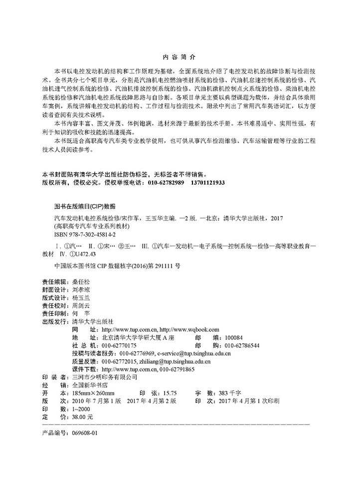 本书以电控发动机的结构和工作原理为基础,全面系统地介绍了电控发动机的故障诊断与检测技术。全书共分七个项目单元,分别是汽油机电控燃油喷射系统的检修、汽油机怠速控制系统的检修、汽油机进气控制系统的检修、汽油机排放控制系统的检修、汽油机微机控制点火系统的检修、柴油机电控系统的检修和汽油机电控系统故障思路与自诊断。各项目单元主要以典型课题为载体,并结合具体乘用车案例,系统讲解电控发动机的结构、工作过程与检测技术。附录中列出了常用汽车英语词汇,以方便读者查阅有关技术说明。 本书内容丰富、图文并茂、体例饱满,选材来源于最新的技术手册。本书难易适中、实用性强,有利于知识的吸收和技能的迅速提高。 本书既适合高职高专汽车类专业教学使用,也可供从事汽车检测维修、汽车运输管理等行业的工程技术人员阅读参考。