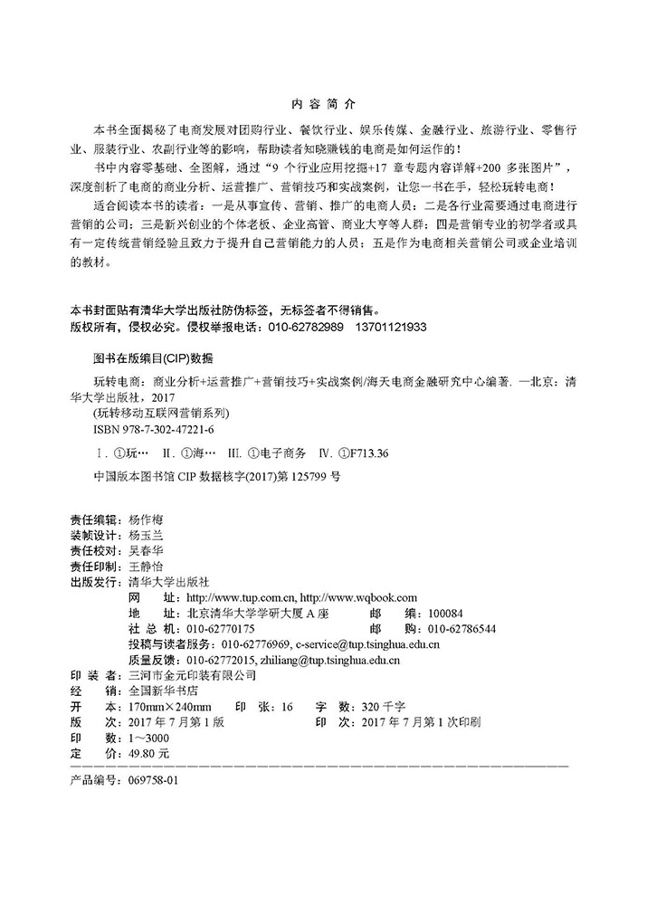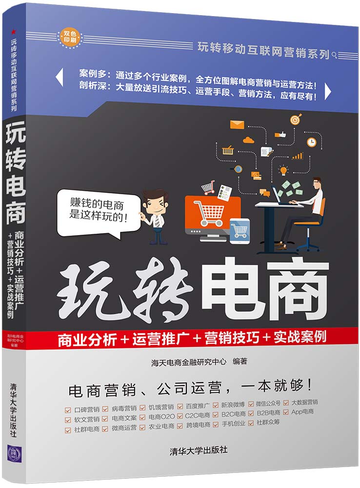 本书全面揭秘了电商发展对团购行业、餐饮行业、娱乐传媒、金融行业、旅游行业、零售行业、服装行业、农副行业等的影响,帮助读者知晓赚钱的电商是如何运作的! 书中内容零基础、全图解,通过“9个行业应用挖掘+17章专题内容详解+200多张图片”,深度剖析了电商的商业分析、运营推广、营销技巧和实战案例,让您一书在手,轻松玩转电商! 适合阅读本书的读者:一是从事宣传、营销、推广的电商人员;二是各行业需要通过电商进行营销的公司;三是新兴创业的个体老板、企业高管、商业大亨等人群;四是营销专业的初学者或具有一定传统营销经验且致力于提升自己营销能力的人员;五是作为电商相关营销公司或企业培训的教材。