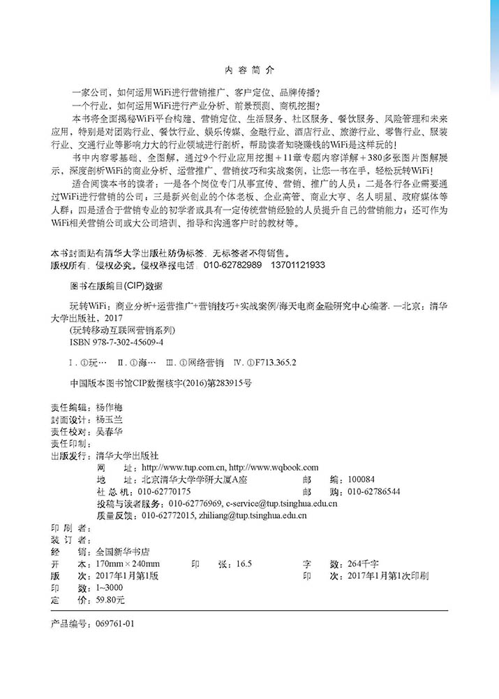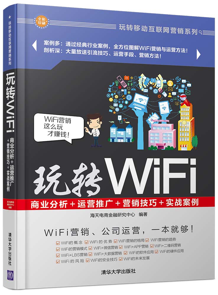 一家公司,如何运用WiFi进行营销推广、客户定位、品牌传播? 一个行业,如何运用WiFi进行产业分析、前景预测、商机挖掘? 本书将全面揭秘WiFi平台构建、营销定位、生活服务、社区服务、餐饮服务、风险管理和未来应用,特别是对团购行业、餐饮行业、娱乐传媒、金融行业、酒店行业、旅游行业、零售行业、服装行业、交通行业等影响力大的行业领域进行剖析,帮助读者知晓赚钱的WiFi是这样玩的! 书中内容零基础、全图解,通过9个行业应用挖掘+11章专题内容详解+380多张图片图解展示,深度剖析WiFi的商业分析、运营推广、营销技巧和实战案例,让您一书在手,轻松玩转WiFi! 适合阅读本书的读者:一是各个岗位专门从事宣传、营销、推广的人员;二是各行各业需要通过WiFi进行营销的公司;三是新兴创业的个体老板、企业高管、商业大亨、名人明星、政府媒体等人群;四是适合于营销专业的初学者或具有一定传统营销经验的人员提升自己的营销能力;还可作为WiFi相关营销公司或大公司培训、指导和沟通客户时的教材等。