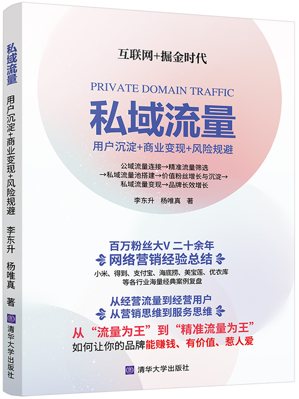 近几年,涌现出许许多多“新”的营销概念。为什么要给这个“新”打上双引号呢?其实这个所谓的“新”营销概念在很久之前就已经出现了,只不过现在生意越来越难做,有些人把这些早就存在的营销概念换了一个说法,换汤不换药,但正好符合这个时代的痛点,因而在网络当中十分火爆,成为“新”的营销概念。 “私域”这个概念在2019年十分火热,从年初开始一直热度不减。许多营销公众号把“私域”描绘得十分神奇,但实际上,“私域”底层逻辑只是从先前的流量运营转变成为用户运营罢了。 随着时代的变化,付费流量的价格水涨船高,导致成本居高不下。早先,品牌仅仅通过流量运营的方式就可以坐享其成,但是现在这种生意模式已经越来越行不通了。因此,品牌方想出了一个新的办法,那就是建立私域流量池,在私域流量池当中,品牌与用户的关系发生转变,两者之间可以是会员,可以是粉丝甚至好友,品牌方无须花钱就能随时与用户进行接触,最终使得生意如滔滔江水般涌来。 这个想法十分美好,但在现实当中,我们不得不考虑一个问题:品牌通过什么样的方式才能获取如此巨大的私域流量呢?聪明的朋友可能已经想到了,我们可以通过抖音、淘宝、知乎、小红书以及百度等一系列平台,在这些平台上建立“据点”,从中获取私域流量。要知道,这些平台的用户数量可是亿万级别的,能够带来怎样的收益无须多说。但是,通过什么方式才能够成功获取到私域流量呢? 在不同的平台当中,各个品牌可谓是“八仙过海,各显神通”。本书主要内容就是向大家分享一些方法,帮助大家在电商平台建立起自己的“据点”,从而获取私域流量。