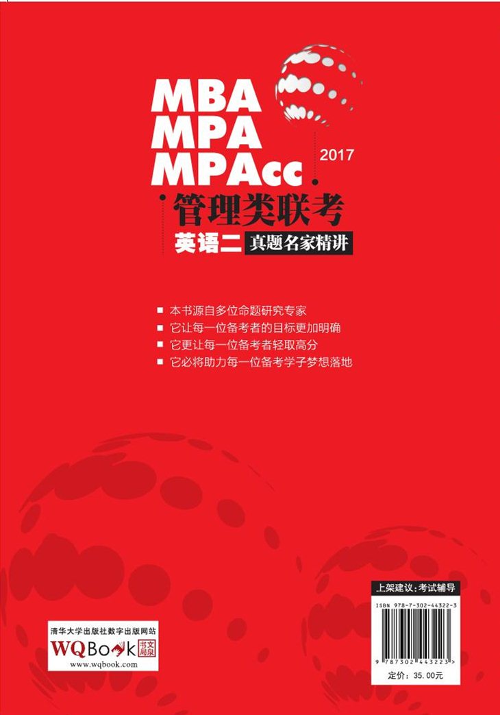 经历了国家教育部对学术硕士和专业硕士不断的改革,最终专业硕士成为了目前考研的一个主导,覆盖人群包含了在职人群和在校学生,所有的这些考生,英语是其必考的一个科目,它不仅顺应国家化的发展,也是督促所有考生走向国际化的一个潮流。 为了帮助所有备考MBA、MPA、MEM、MPAcc等管理类联考考生,包括即将进入联考的另外一个高端项目EMBA的考生,编者细心地将2010年以来的国家联考英语试题进行了全面整编,并且对此进行了细致的分析,采用高屋建瓴的剖析,让不管哪个层次的考生都可以受益匪浅。最终都可以顺利通过英语考试。 英语的复习核心基础是词汇,所以我们编者在整个编写过程中,始终不断突出核心考点词汇的重要作用,字里行间让考生注重对历年核心词汇的记忆。在词汇有了一定的基础之后,编者又一次以考试通过为目的,加强阅读的重要性,结合历年阅读的出处,结合历年阅读的做题技巧,我们给予了全方位的解析。可以这样说,编者根据从业多年的英语辅导经验,这次的解析直击命题者的出题思路,让读者通过阅读本书,就可以明确每一个英语命题者的思路,掌握命题者的出题考点。 在本书成册的过程中,非常感谢清华大学出版社彭欣编辑的大力支持,同时,更加感谢来自一线教学团队的周远飞、李程、李发进、郭彦丘、马林、孙惠、张硕等老师的齐力帮助,才得以最终让本书成功面市。 最后,我们诚挚地祝福广大备考2017年的读者朋友们: 金榜题名,身体健康,阖家欢乐,一帆风顺