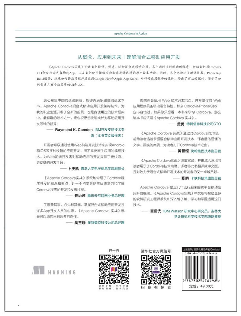《Apache Cordova实战》,基于混合式移动应用开发架构,讲授如何设计,创建,运行混合式移动Apps。通过直观,真实的示例程序,开发者将学会使用Cordova CLI命令行方式来构建Apps,以及使用摄像头和加速度计这样的原生设备功能。同时也讲述了测试技术,探索PhoneGap Build服务,以及如何将应用程序提交到Google Play和Apple App Store。对移动应用程序的设计,做出了有益的探讨,演示了如何创建高效,具有专业品质的UI和UX。本书涉及的主题: