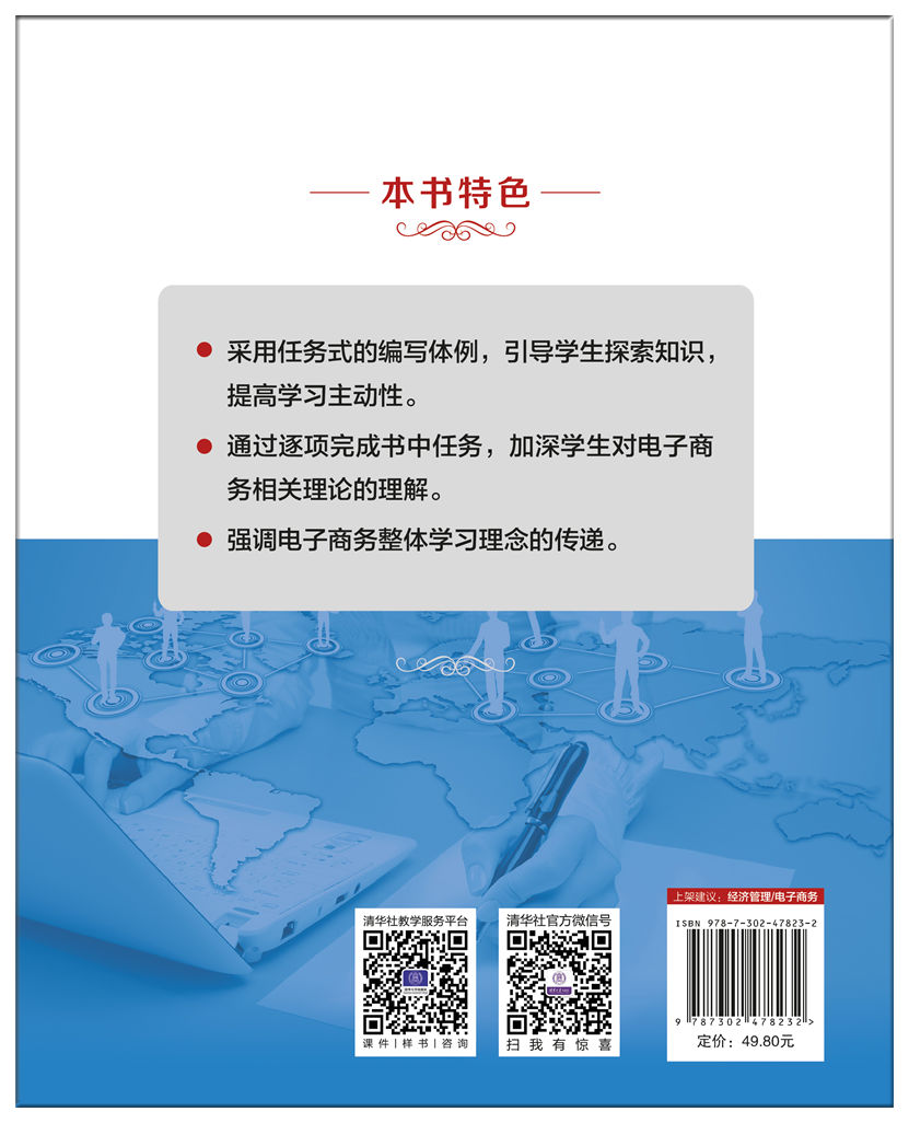 电子商务是一个商务过程电子化的商务形态。进入21世纪以来,电子商务的应用跨入了一个全业态渗透、发展迅猛、影响深远的发展阶段。由于电子商务充分利用现代信息技术,创造了以互联网为基础的全新商业模式,改变了商业伙伴之间的合作方式,因此,电子商务是包括购买、销售在内的电子化沟通、协同、合作的全新商务途径。 目标读者 本书主要供电子商务、市场营销、工商管理、物流管理、信息管理与信息系统、国际贸易、财务管理、金融等相关专业本科生学习“电子商务(概论)”课程使用,也可作为企事业单位电子商务的培训教材,以及从事电子商务相关工作的企业管理人员和业务人员的参考书。对教材中的部分内容进行删减后,本书也可作为高职高专相关专业的教材使用。 本书特色 第一,本书通过任务式设计,引导学生探索知识,提高学习主动性。本书在每章每节的开始基本都设计了相应的认知性任务,引导学生在学习理论知识之前预先形成一定的认识。学生在完成任务的过程中可能会遇到一些问题,他们带着自己的认识和所遇到的问题走进课堂,以此作为与课堂和老师连接的纽带,这样还可以活跃学习氛围,改善课堂面貌。同时,任务的存在还能够加强学生之间、师生之间和教师之间的相互交流与学习,从而实现教学相长。因此,本书在一定程度上填补了本科相关教材在该领域的空白,这也是本书有别于其他同类教材的一个重要方面。 第二,本书通过完成任务的形式,提高学生对电子商务各方面知识的直观感受,以此增强学生的学习兴趣。由于理论知识相对来说较缺乏吸引力,学生在学习过程中难免感到乏味,学生通过完成任务,可对相关知识在某些领域的应用有较为直观的感受,把课堂上的抽象理论与实际应用相联系...