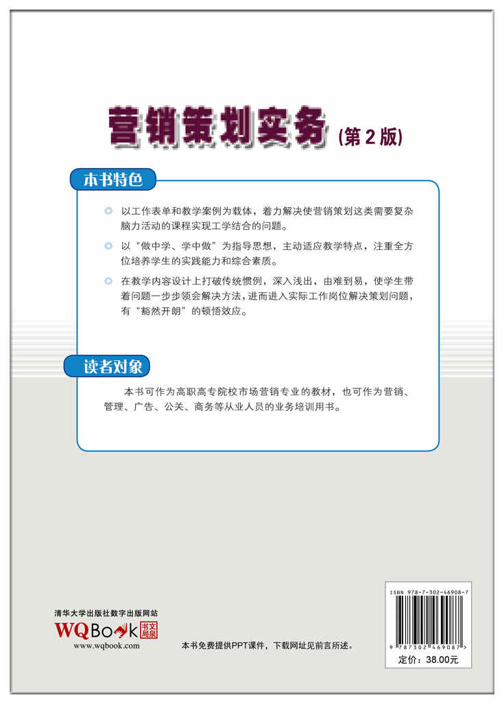 本教材针对高职院校市场营销专业的就业岗位,立足全国大型企业,在对农业、能源化工业、酒店业、零售业等行业典型营销策划岗位工作任务和流程进行充分调研和分析的基础上,以实际工作任务为引领,以企业营销策划活动为主线,采用纵(工作流程)横(并行的工作任务)交错的结构来展示教学内容,通过实战演练、案例仿真等形式来组织教学内容,在尽可能真实的环境中,培养学生的操作能力和综合能力。本教材具有以下特色:(1) 以工作表单和教学案例为载体,着力解决使营销策划这类需要复杂脑力活动的课程实现工学结合的问题。(2) 以“做中学、学中做”为指导思想,主动适应教学特点,注重全方位培养学生的实践能力和综合素质。(3) 在教学内容设计上打破传统惯例,深入浅出,由难到易,使学生在带着问题一步步领会解决方法后,进入实际工作岗位解决策划问题,有“豁然开朗”的顿悟效应。