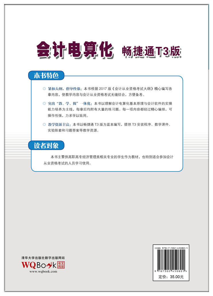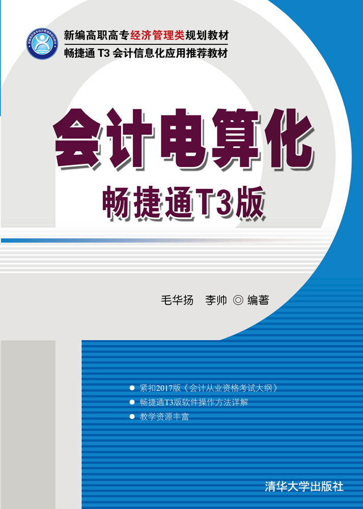 会计电算化是一门发展迅速、实践性非常强的学科。本书基于2017版《会计从业资格考试大纲》,并结合职业院校的教学实际情况,涵盖会计电算化概述、会计软件的运行环境、会计软件的应用、电子表格在会计中的应用、畅捷通T3软件应用(含总账、往来管理、现金银行、工资、固定资产、报表等模块)等内容,能较好地帮助学生在提升会计电算化应用水平的同时,兼顾考取会计从业资格证书的需求。 本书主要供高职高专经济管理类相关专业的学生作为教材,也特别适合参加会计从业资格考试的人员学习使用。本书提供丰富的教学资源,T3安装程序、实验账套、课件和习题答案等可以从http://landmao.blog.163.com列示的相关资料中下载。