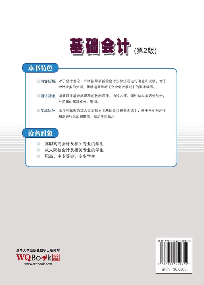 本教材的编写出版主要基于以下两点考虑。一是基础会计课程的学习是财务会计类课程学习的开始,是学习者迈进会计门槛的必经之路,其学习效果如何直接影响到其他财务会计类课程的学习。一本好的基础会计教材,对学生从原理上理解和掌握会计基本理论、基本方法和基本技能,顺利走进会计大门是非常重要的。二是我国于2006年颁布了新的《企业会计准则》,对会计理论和会计实务都赋予了新的内涵,这就要求广大会计教育工作者有责任按照新的思路组织教学。 本教材具有以下特点: 第一,内容新颖。对于会计理论,严格按照最新的会计法律法规进行阐述和说明;对于会计业务的处理,能够遵循最新《企业会计准则》的核算要求编写,确实做到了以全新的内容呈现给读者。 第二,通俗易懂。在多年的教学实践中,我们切实体会到基础会计课程的“原理性”特别重要,如果学生不能理解某一知识点,不能明白某一经济业务处理的缘由,就会形成很多知识盲区,甚至会误导学生死板地学习会计类课程。因此,在本书编写过程中,我们特别注意遵循职业基础课程的教学规律,由表及里、由浅入深、衔接自然,理论与实际巧妙结合,做到了对问题的解释通俗、充分、透彻,对难点的处理方法多样,使学生通过学习,对会计的基本理论、基本原则、基本方法和基本业务处理,既知其然又知其所以然,并在此基础上灵活运用。 第三,学练结合。基础会计课程是一门技能型的专业基础课,为了使学生对所学知识进行巩固并有所提高,能够做到学以致用,本教材在每章之后均附有复习思考题,根据课程需要,部分章节还附有核算题供学生检验学习效果之用。另外,本书还配备专用的实训教材《基础会计技能训练》(ISBN:978-7-302...