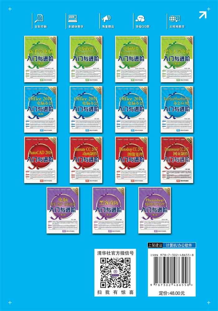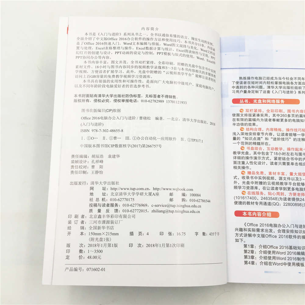 前言 熟练操作电脑已经成为当今社会不同年龄层次的人群必须掌握的一门技能。为了使读者在短时间内轻松掌握电脑各方面应用的基本知识,并快速解决生活和工作中遇到的各种问题,清华大学出版社组织了一批教学精英和业内专家特别为电脑学习用户量身定制了这套《入门与进阶》系列丛书。 丛书、光盘和网络服务 双栏紧排,全彩印刷,图书内容量多实用 本丛书采用双栏紧排的格式,使图文排版紧凑实用,其中260多页的篇幅容纳了传统图书一倍以上的内容。从而在有限的篇幅内为读者奉献更多的电脑知识和实战案例,让读者的学习效率达到事半功倍的效果。 结构合理,内容精炼,操作技巧轻松掌握 本丛书紧密结合自学的特点,由浅入深地安排章节内容,让读者能够一学就会、即学即用。书中的范例通过添加大量的“知识点滴”和“进阶技巧”的注释方式突出重要知识点,使读者轻松领悟每一个范例的精髓所在。 书盘结合,互动教学,操作起来十分方便 丛书附赠一张精心开发的多媒体教学光盘,其中包含了18小时左右与图书内容同步的视频教学录像。光盘采用真实详细的操作演示方式,紧密结合书中的内容对各个知识点进行深入的讲解。光盘界面注重人性化设计,读者只需要单击相应的按钮,即可方便地进入相关程序或执行相关操作。 赠品免费,素材丰富,量大超值,实用性强 附赠光盘采用大容量DVD格式,收录书中实例视频、源文件以及3~5套与《Office 2016电脑办公入门与进阶》内容相关的多媒体教学视频。此外,光盘中附赠的云视频教学平台能够让读者轻松访问上百GB容量的免费教学视频学习资源库,在让读者学到更多电脑知识的同时真正做到物超所值。 在线服务...