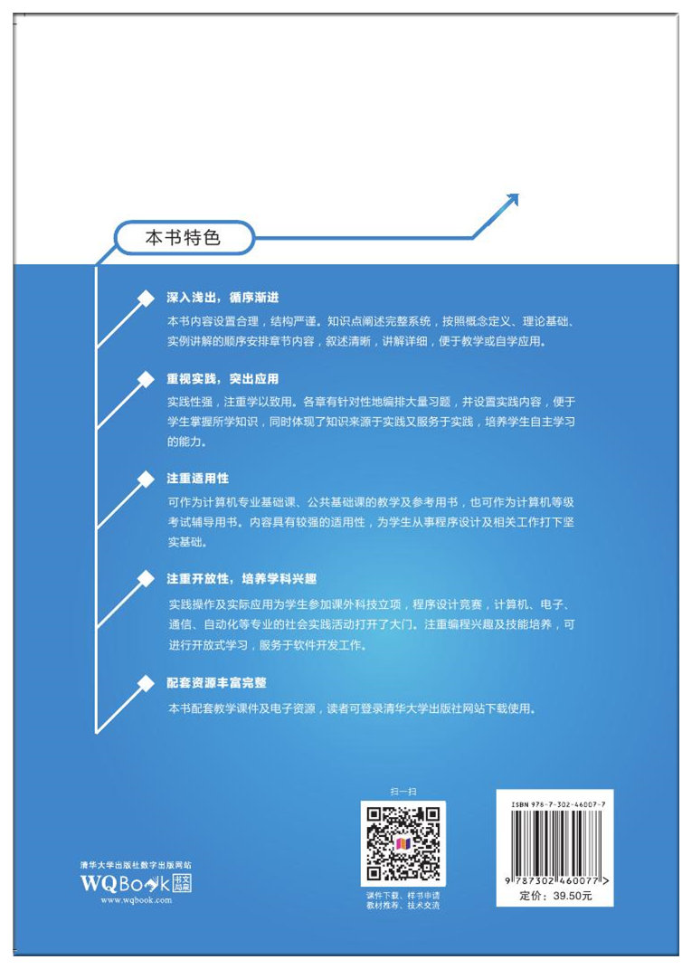 本书内容设置合理,结构严谨。知识点阐述完整系统,按照概念定义、理论基础、实例讲解的顺序安排章节内容,叙述清晰,讲解详细,便于教学或自学应用。 实践性强,注重学以致用。各章有针对性地编排大量习题,并设置实践内容,便于学生掌握所学知识,同时体现了知识来源于实践又服务于实践,培养学生自主学习的能力。 可作为计算机专业基础课、公共基础课的教学及参考用书,也可作为计算机等级考试辅导用书。内容具有较强的适用性,为学生从事程序设计及相关工作打下坚实基础。 实践操作及实际应用为学生参加课外科技立项,程序设计竞赛,计算机、电子、通信、自动化等专业的社会实践活动打开了大门。注重编程兴趣及技能培养,可进行开放式学习,服务于软件开发工作。 本书配套教学课件及电子资源,读者可登录清华大学出版社网站下载使用。