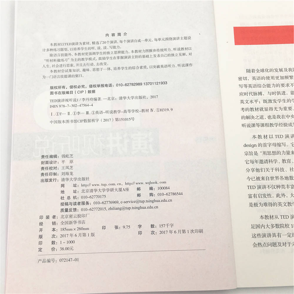 本教材以TED演讲为素材,精选了20个演讲,每个演讲自成一单元,每单元围绕演讲主题设 计多种练习题型,以培养学生的听、说、读、写能力。 除语言技能外,本教材更强调学生的独立思辨能力。本教材力图摒弃传统听力、听说教材以 “听材料做练习”为主的教学模式,鼓励学生在掌握演讲主旨的基础上发表自己的独立见解,对 人生、社会进行思索,并且去行动、去改变。 本教材尝试集知识、趣味、思想于一体,培养学生的综合素质,以突破英语听力、听说课作 为一门语言技能课的窠臼。